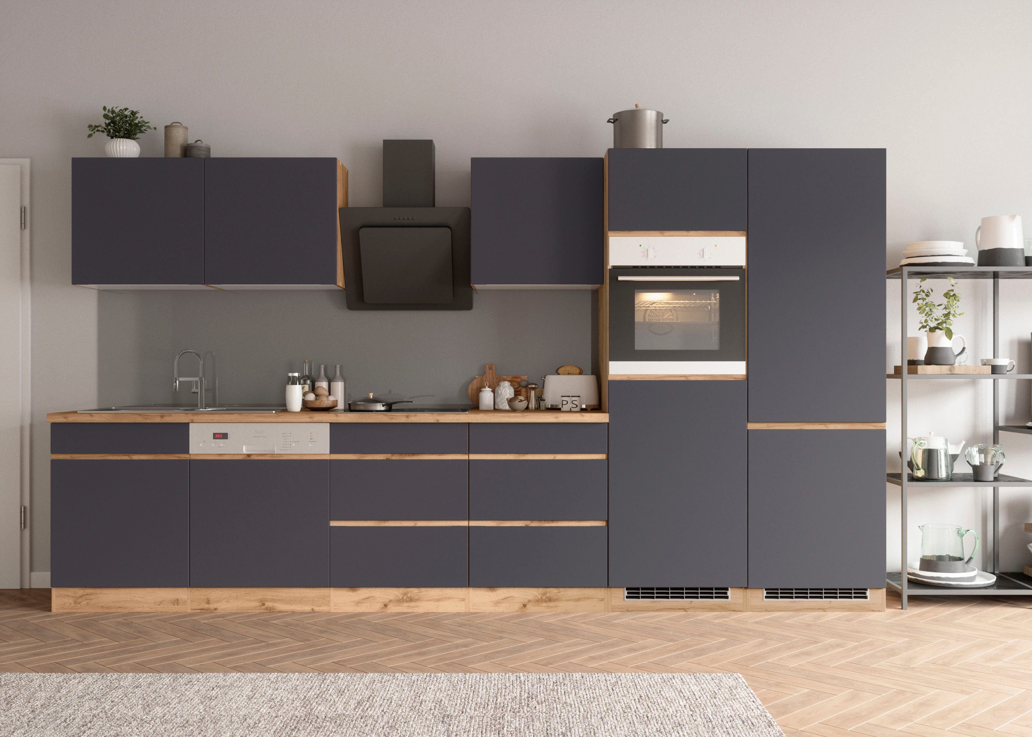 Ausstattung | Durchgehende Arbeitsplatte Einlegeböden höhenverstellbar Seitenverkehrt stellbar Sockelhöhe nicht verstellbar Stellschrauben in den Unterschränken als Montagehilfe zum Ausgleichen von Unebenheiten: 0-4 cm Türen wahlweise rechts/links montierbar inkl. Edelstahl-Auflagespüle, mit Abtropffläche ohne E-Geräte |