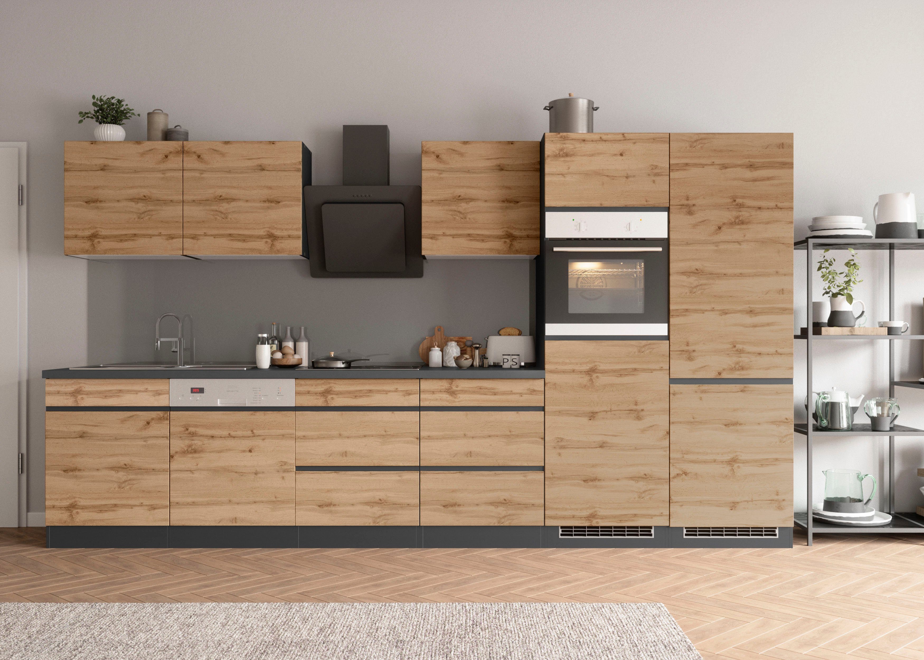 Ausstattung | Durchgehende Arbeitsplatte Einlegeböden höhenverstellbar Seitenverkehrt stellbar Sockelhöhe nicht verstellbar Stellschrauben in den Unterschränken als Montagehilfe zum Ausgleichen von Unebenheiten: 0-4 cm Türen wahlweise rechts/links montierbar inkl. Edelstahl-Auflagespüle, mit Abtropffläche mit E-Geräten weitere Informationen zu Elektrogeräten: siehe Спеціфікація товара (на німецькій) |