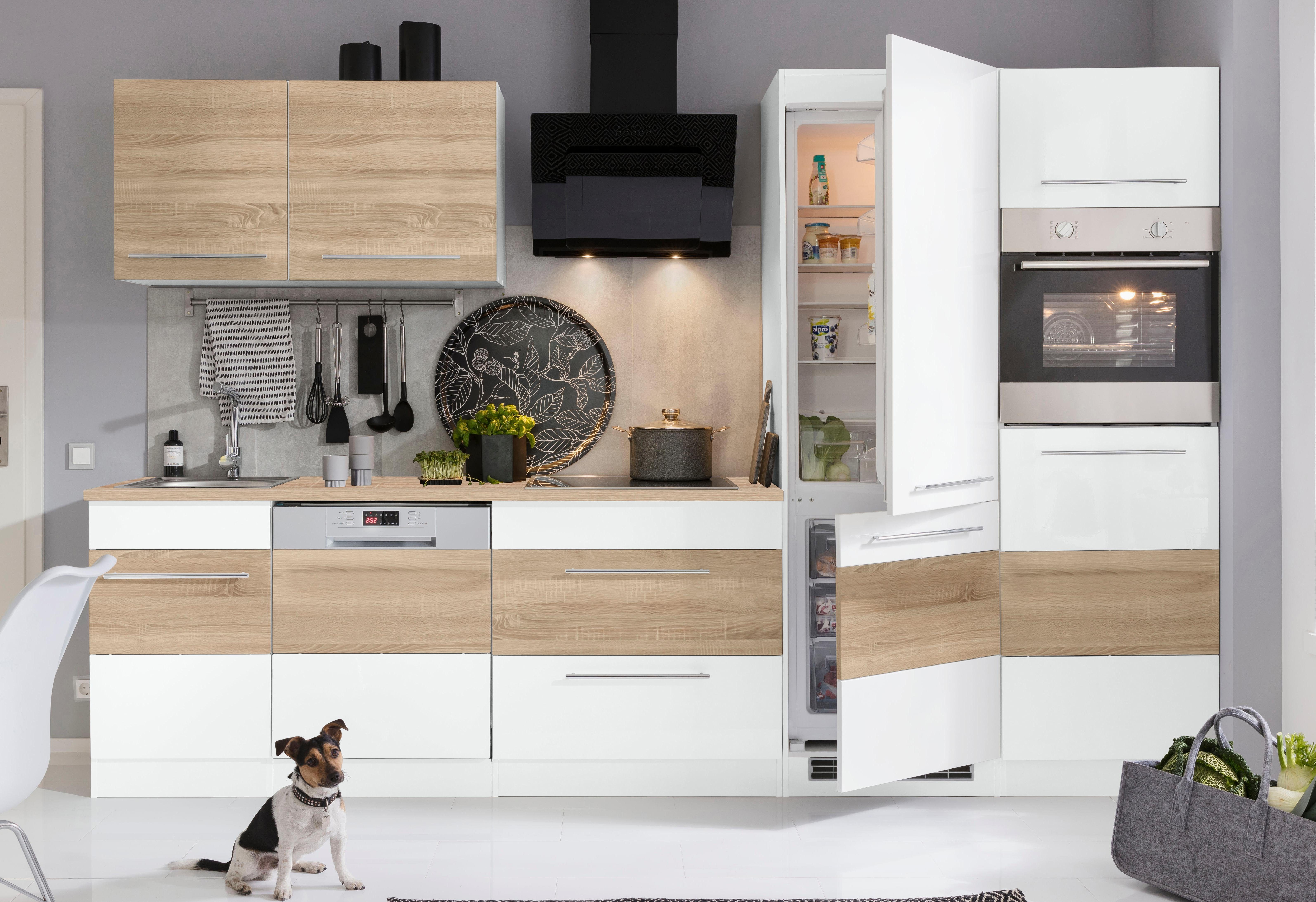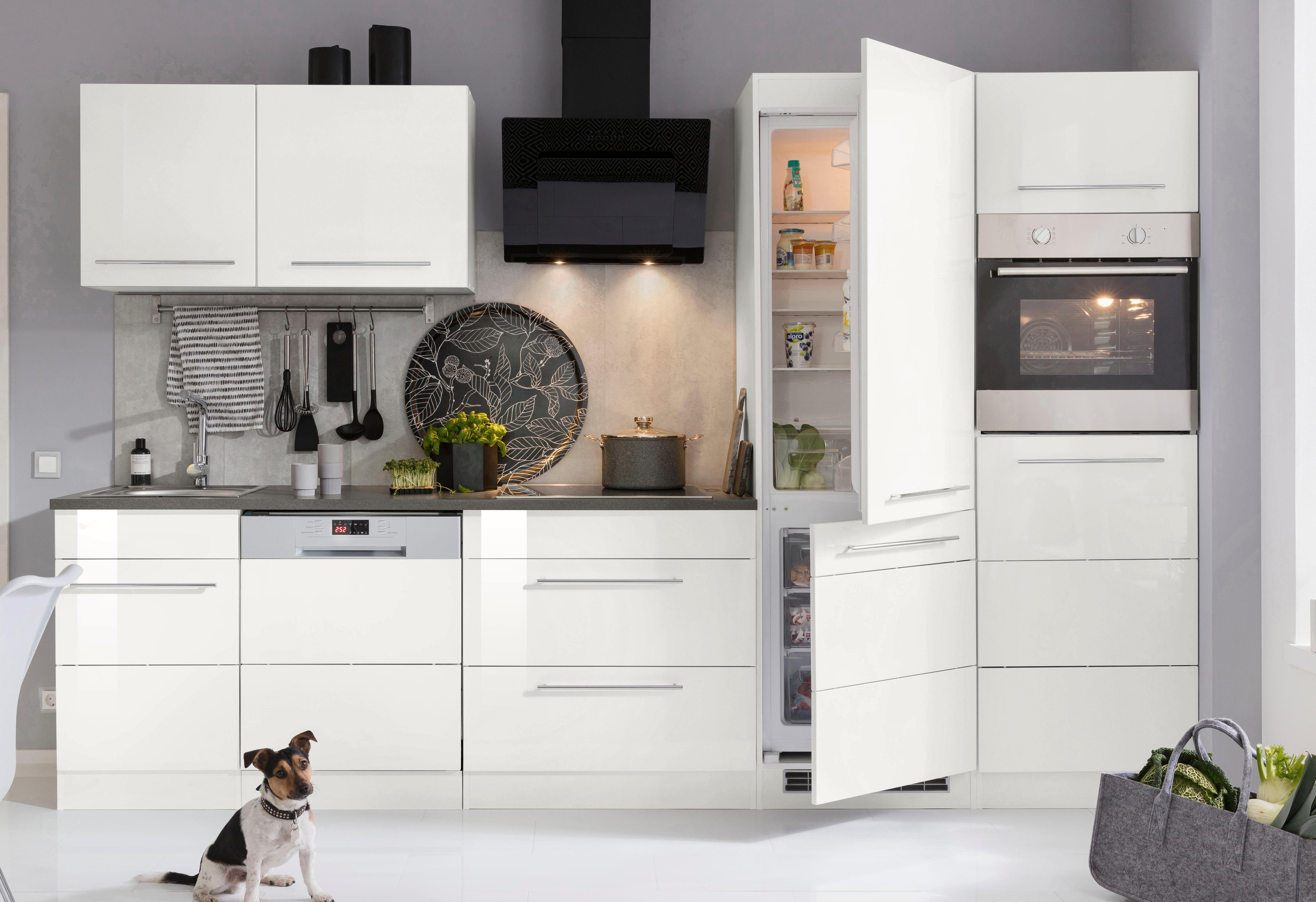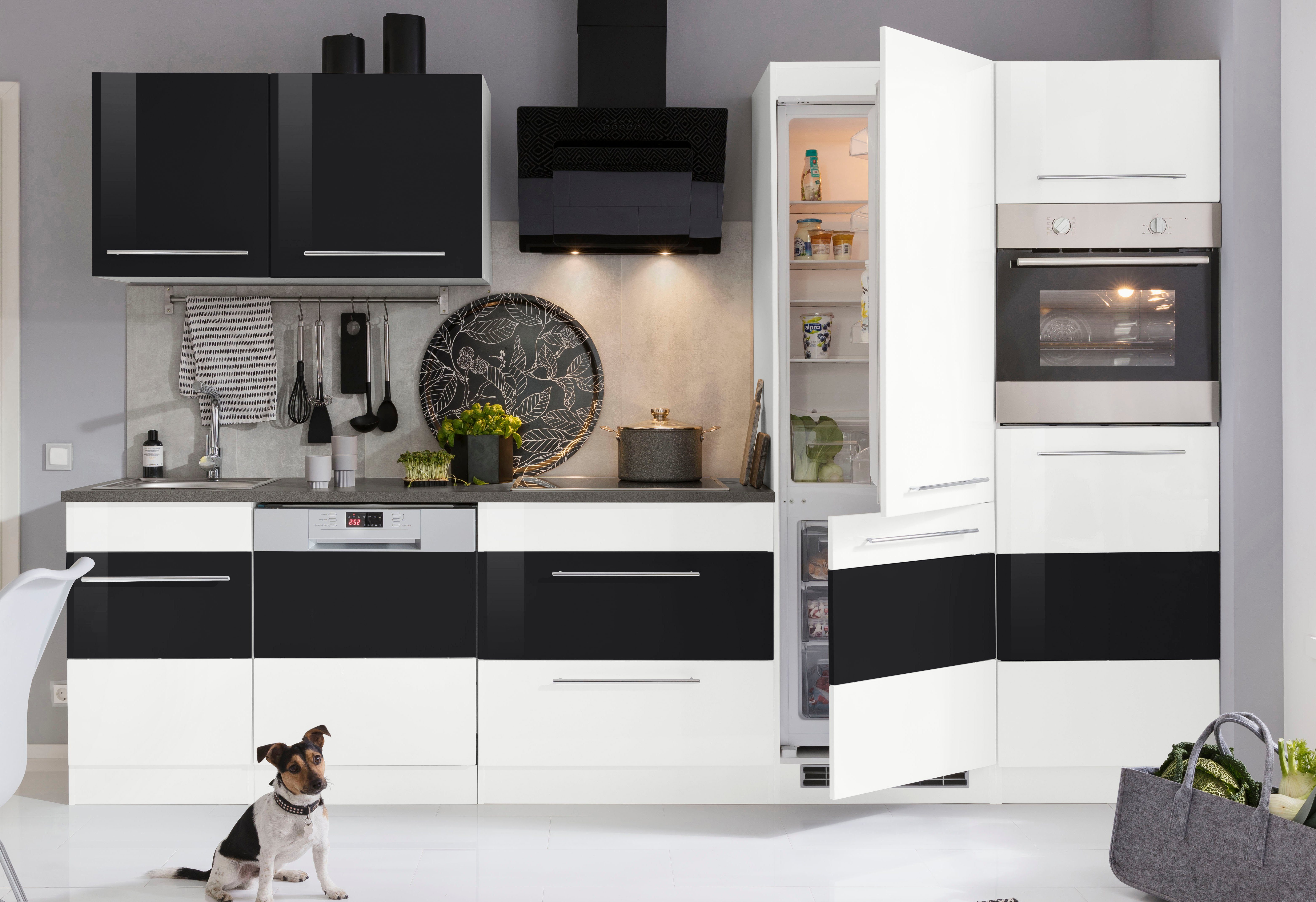 Ausstattung | Durchgehende Arbeitsplatte Einlegeböden der Hängeschränke höhenverstellbar Griffe glänzend verchromt inkl. Edelstahl-Auflagespüle, mit Abtropffläche |