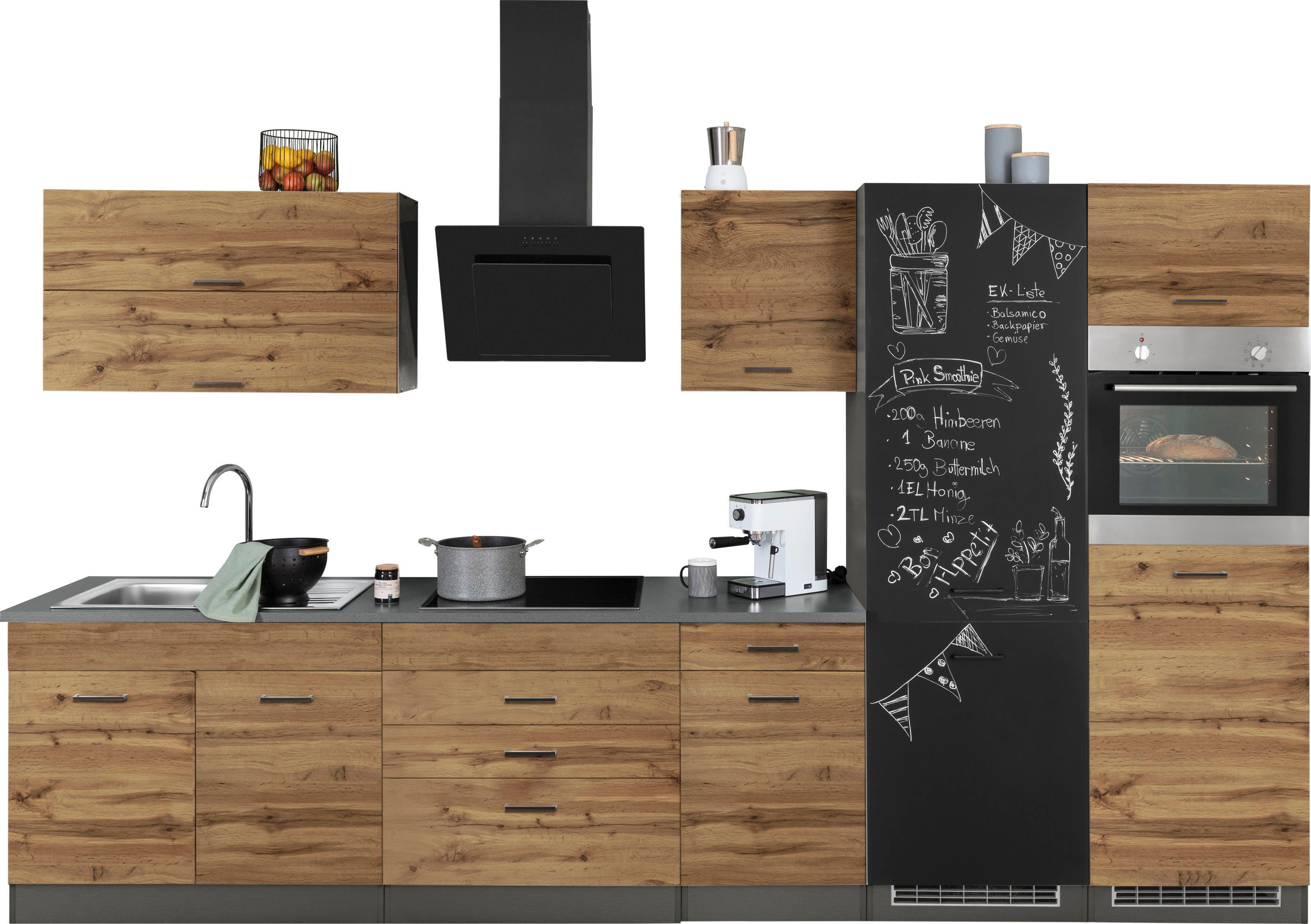 Set beinhaltet | Set bestehend aus: Arbeitsplatte, Backofen, Dunstabzugshaube, Hängeschrank, Kühlschrank, Kühlumbauschrank, Spülenschrank, Unterschrank, Kochfeld