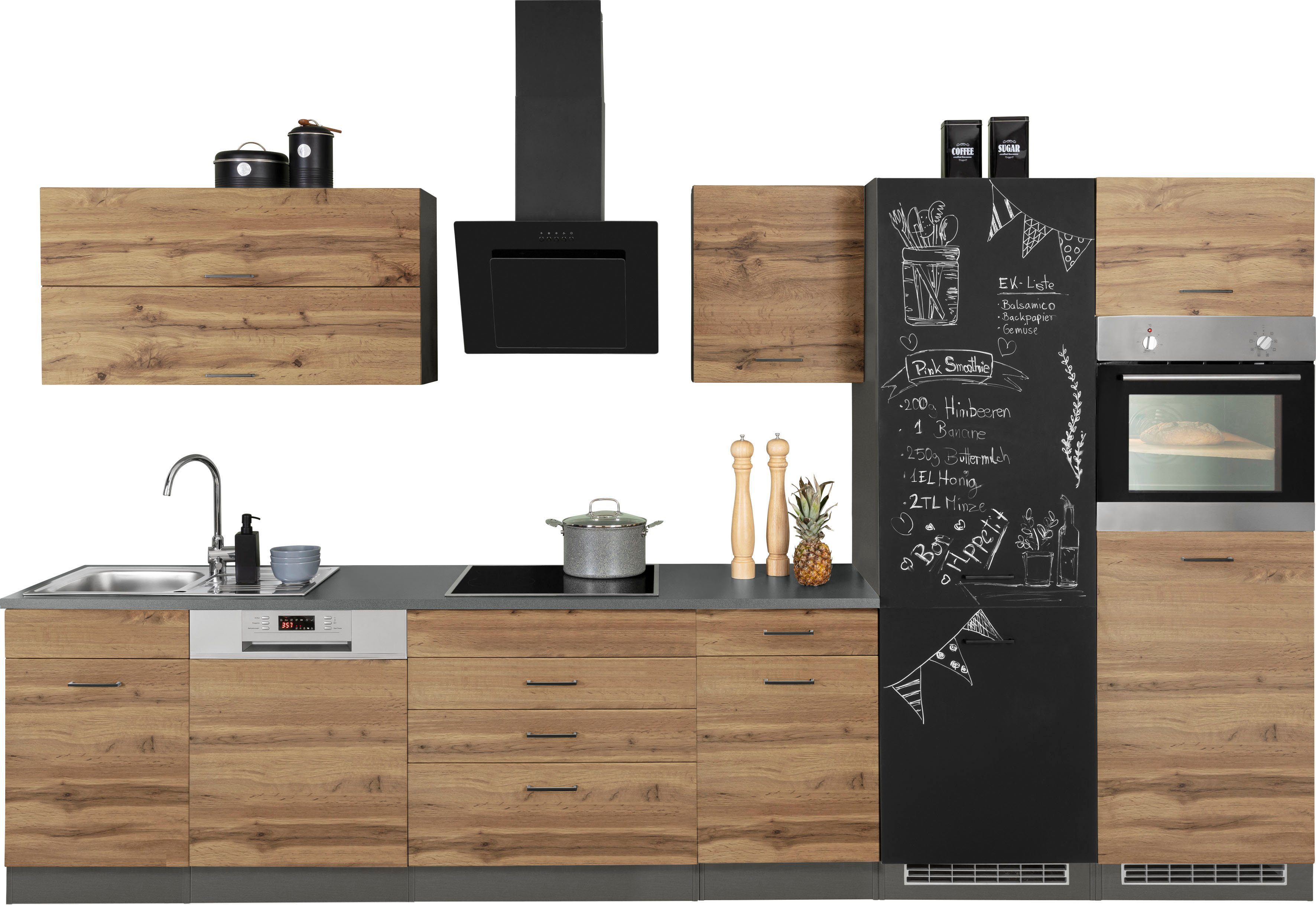 Set beinhaltet | Set bestehend aus: Arbeitsplatte, Backofen, Dunstabzugshaube, Geschirrspüler, Hängeschrank, Kühlschrank, Kühlumbauschrank, Spülenschrank, Unterschrank, Kochfeld