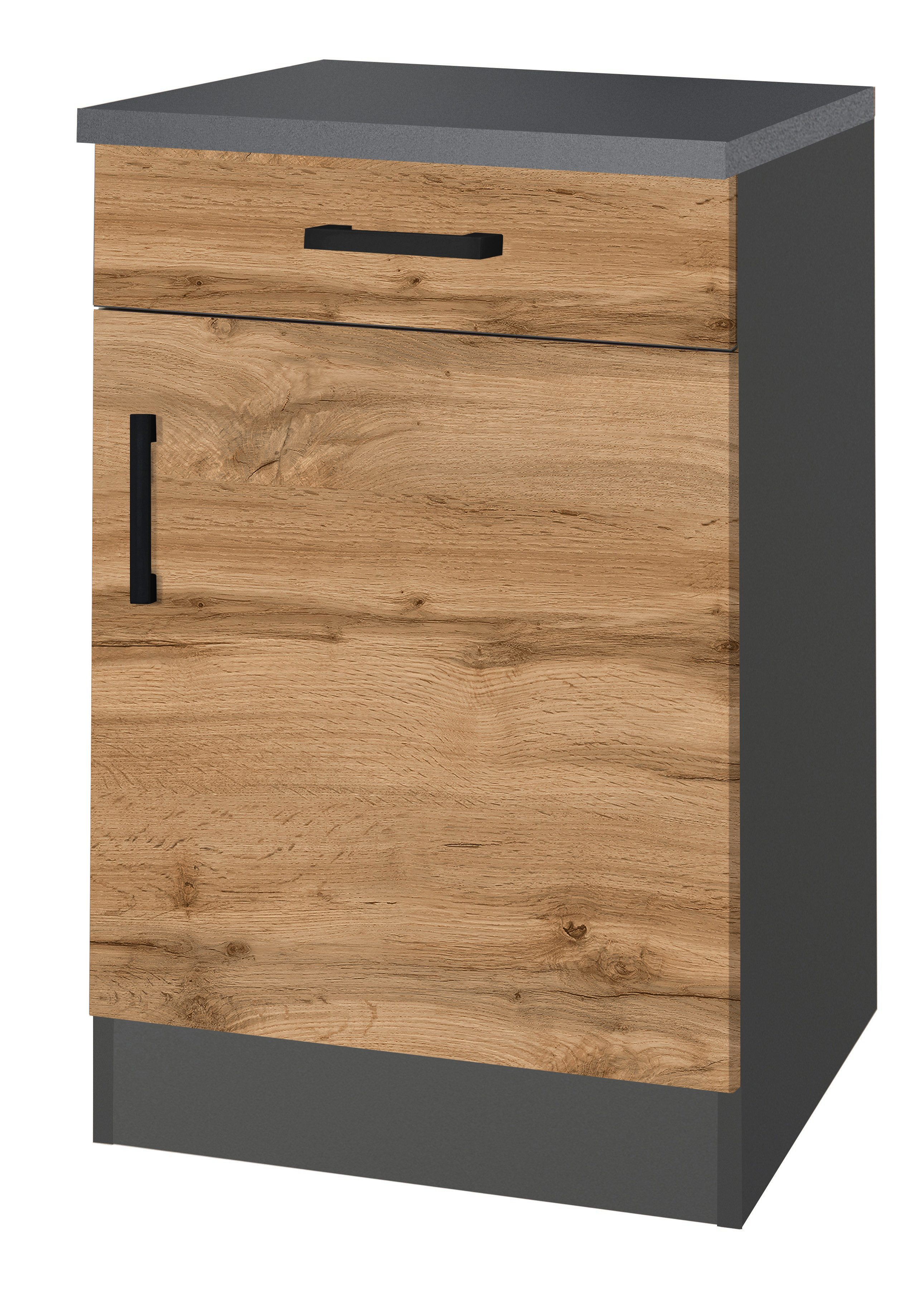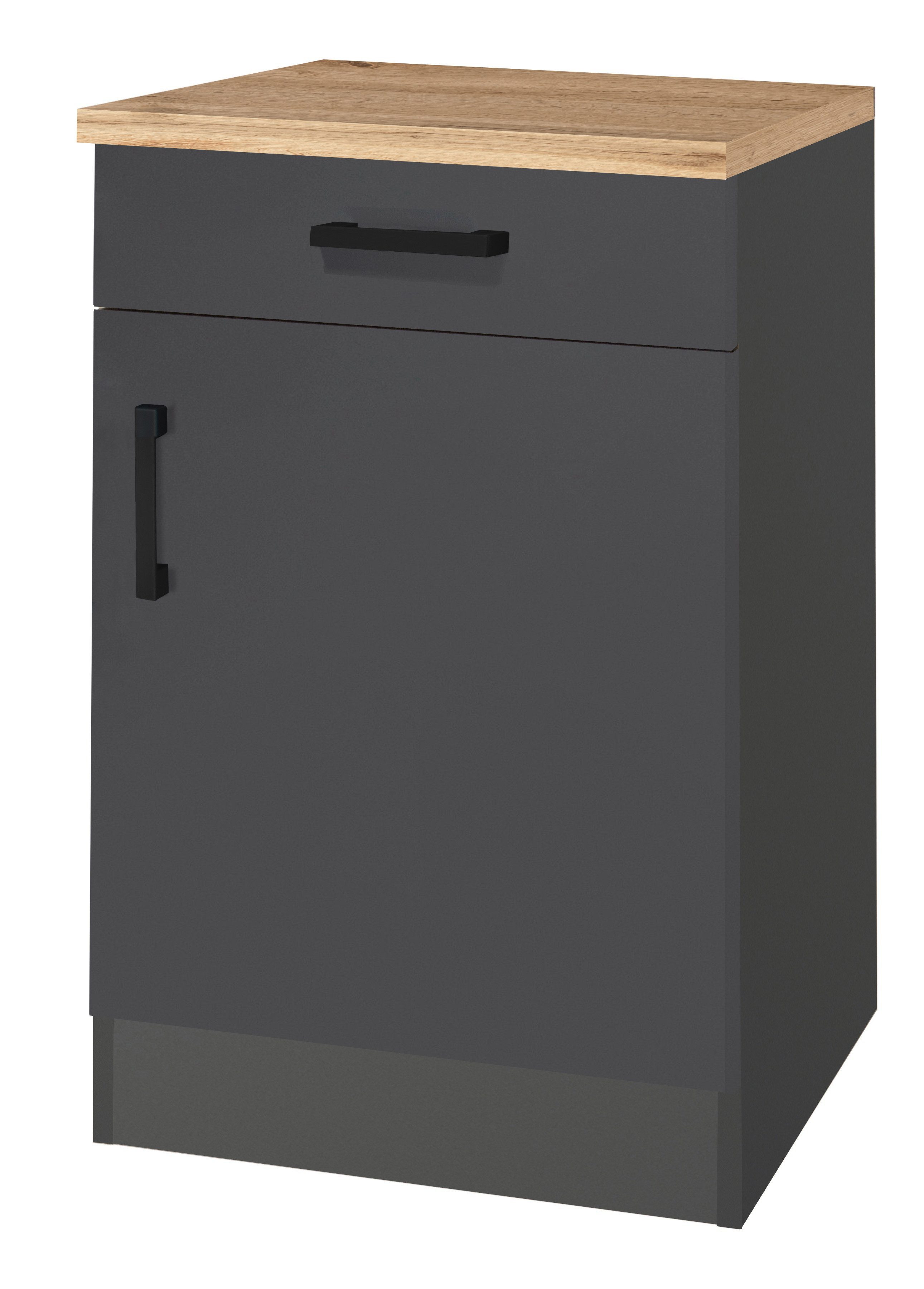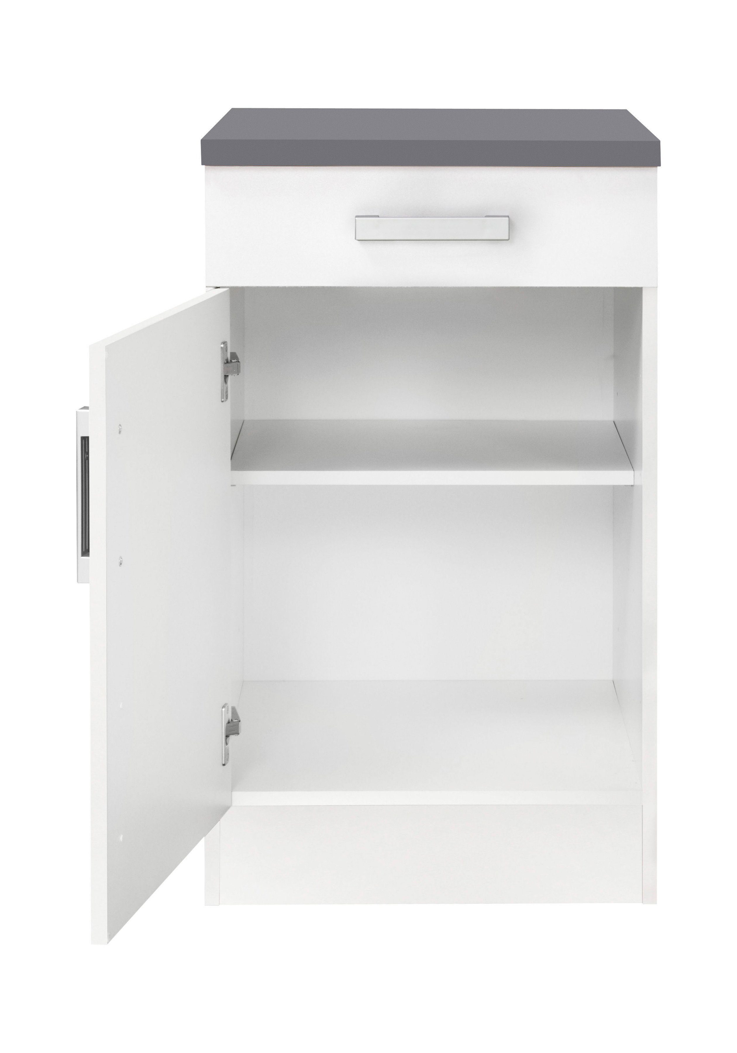 Die Küchenserie »KS-Toronto« mit ihren matten melaminbeschichteten Fronten sieht nicht nur toll aus, sondern birgt auch hinsichtlich der Platzausnutzung ein durchdachtes Konzept. So bietet der Unterschrank mit einer Tür und einem Auszug viel Stauraum. Der Küchenschrank hat silberfarbene Kunststoffgriffe und eine 28 mm starke Arbeitsplatte, der Auszug läuft leichtgängig auf Metalllaufschienen, die Tür ist wechselseitig montierbar.