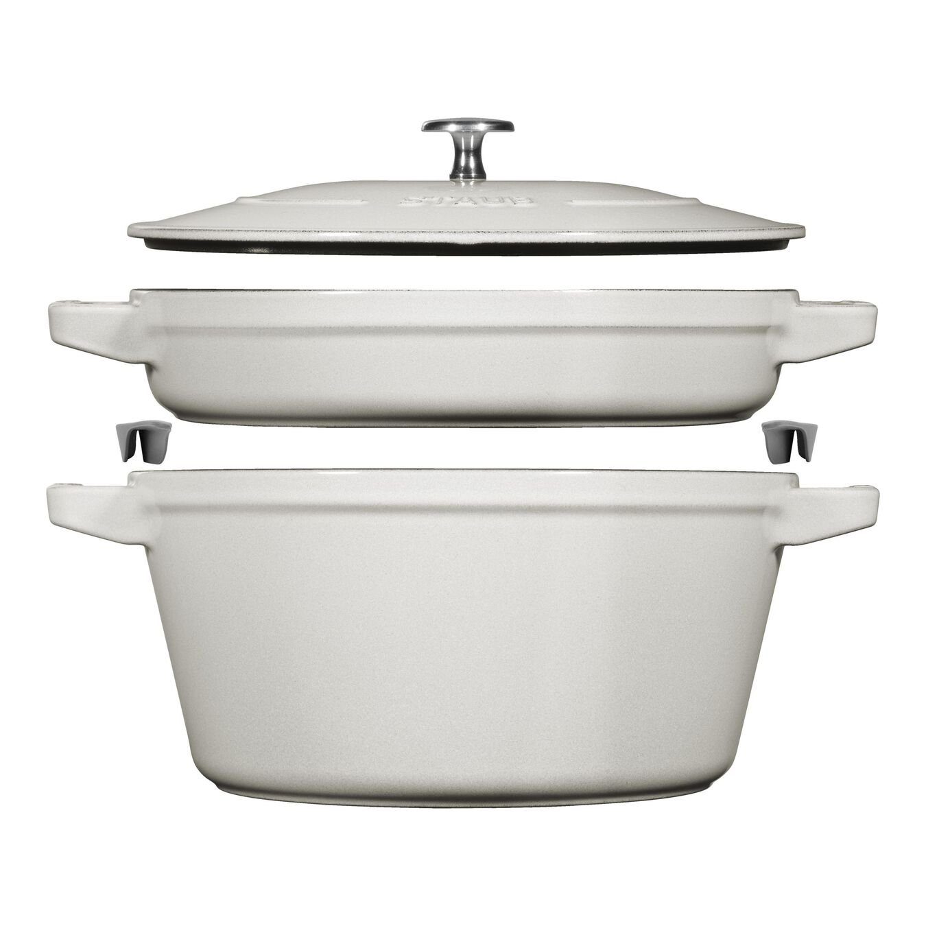 Staub La Cocotte Kochtopfset, 2-tlg rund Gusseisen Weisser Trüffel 40508-385-0 Weiße Magie für deine Küche Set besteht aus Cocotte, Pfanne und Deckel Stapelbar für eine platzsparende Lagerung Geeignet für alle Herdplatten, einschließlich Induktion Elegante Farbe "weißer Trüffel" Beschreibung Die französische Küche ist seit langem der Inbegriff für exzellente Kochkunst, so wie die französische Mode für zeitlose Eleganz steht. Mit unseren emaillierten Gusseisenprodukten wollen wir beides vereinen: hervorragende Kocheigenschaften und elegantes Aussehen. Die Farbe weißer Trüffel, eine Hommage an die seltene Zutat, die Brillat-Savarin den "Diamanten der Küche" nannte, unterstreicht die Premiumqualität. Dieses Set besteht aus einer Cocotte, einer Pfanne und einem Deckel, jeweils mit einem Durchmesser von 24 cm. Es eignet sich hervorragend, um ganze Mahlzeiten für eine Familie zu kochen, zum Beispiel Fleisch, Fisch oder Gemüse in der Pfanne zu braten und Reis oder Nudeln in der Cocotte zuzubereiten. Natürlich kann alles auch in den Backofen, wo die Cocotte ihre Stärken beim Schmoren oder bei der Zubereitung von Auflaufrezepten ausspielen kann. Zum Set gehören auch zwei Randschützer, so dass die Töpfe übereinander gelagert werden können, ohne dass sie hängen bleiben oder beschädigt werden. Das Ergebnis ist nicht einfach nur ein Stapel Töpfe und Pfannen, sondern ein ordentlich gestapeltes Set mit perfekt aufeinander abgestimmtem Kochgeschirr, das in Ihrer Küche eine gute Figur macht. Vielleicht finden Sie es sogar zu schön, um es in einem Schrank zu verstecken. 2-teiliges Set mit Cocotte, Pfanne und Deckel 24 cm Durchmesser Inklusive Randschützer für eine sichere Aufbewahrung Hochwertiges emailliertes Gusseisen Geeignet für alle Herdplatten, einschließlich Induktion Eigenschaften Farbe: Weisser Trüffel Material: Gusseisen Deckel vorhanden: Ja Induktion: Ja Backofen geeignet: Ja Gefrierschrank geeignet: Ja Herdplatten geeignet: Ja Lieferumfang: 2 Abmessungen Gewicht netto: 7,00 kg Produktlänge: 30,80 cm Produktbreite: 24,00 cm Produkthöhe: 21,60 cm