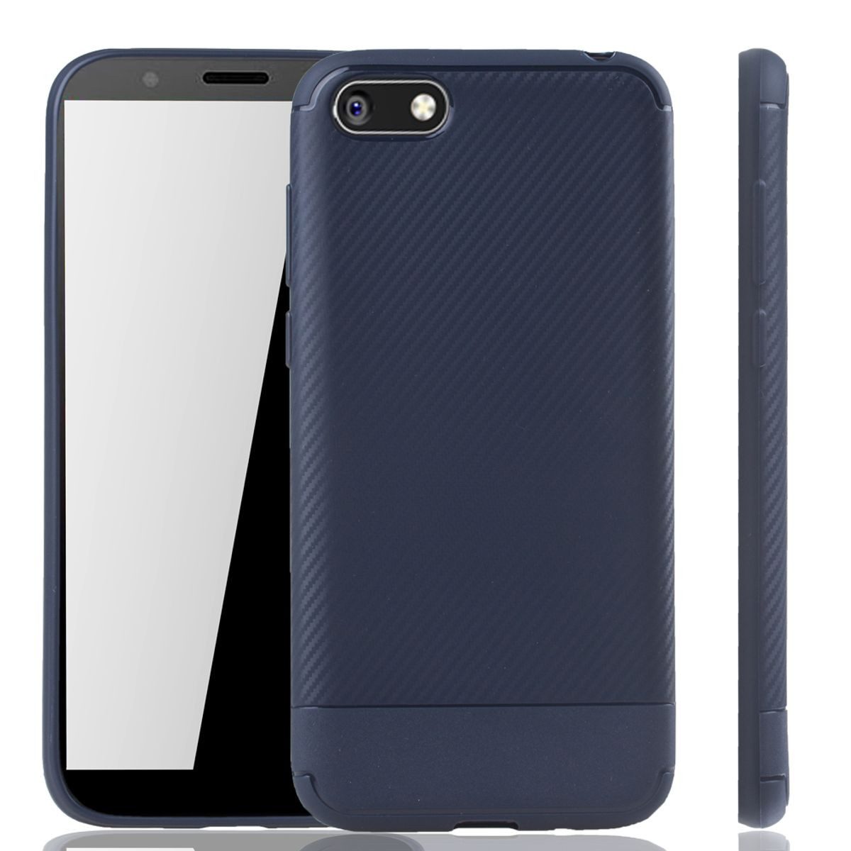 Die Huawei-Y5-2018-Schutzhülle ist in klassischen Farben auswählbar und besitzt Prägungen im Carbon Look.