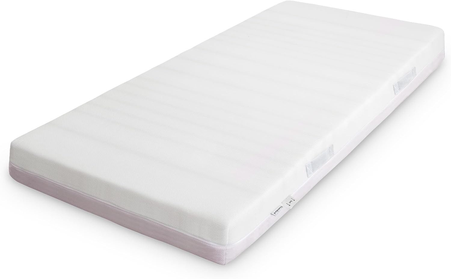 Die 2-in-1 Wendematratze aus hochwertigem, formstabilem High Resilience Schaum vereint zwei Härtegrade in einem. So findet jedes Familienmitglied individuell seine komfortable und bequeme Liegefläche. Die eine Seite besitzt den Härtegrad “fest” (H3), die andere Seite den Härtegrad “medium” (H2). Für einfaches Drehen und Wenden der Matratze ist diese mit stabilen und praktischen Griffbändern ausgestattet.