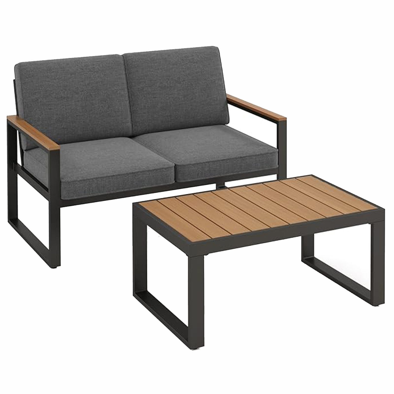 Genießen Sie einen Moment der Ruhe und Entspannung mit dem 2-teiligen Gartenmöbel Set. Setzen Sie sich auf die elastischen Kissen aus weichem Olefin-Gewebe für unvergleichlichen Komfort und lehnen Sie sich an die Rückenlehne und die Armlehnen für totale Entspannung. Greifen Sie einfach nach Ihrem Lieblingsgetränk auf dem Tisch. Der Rahmen aus rostfreiem Aluminium und die Tischplatte aus wasser- und sonnenbeständigem WPC sorgen dafür, dass Sie die Gartengarnitur lange Zeit im Freien nutzen können. Das leichte Sofa und der Tisch sind auch leicht zu transportieren.