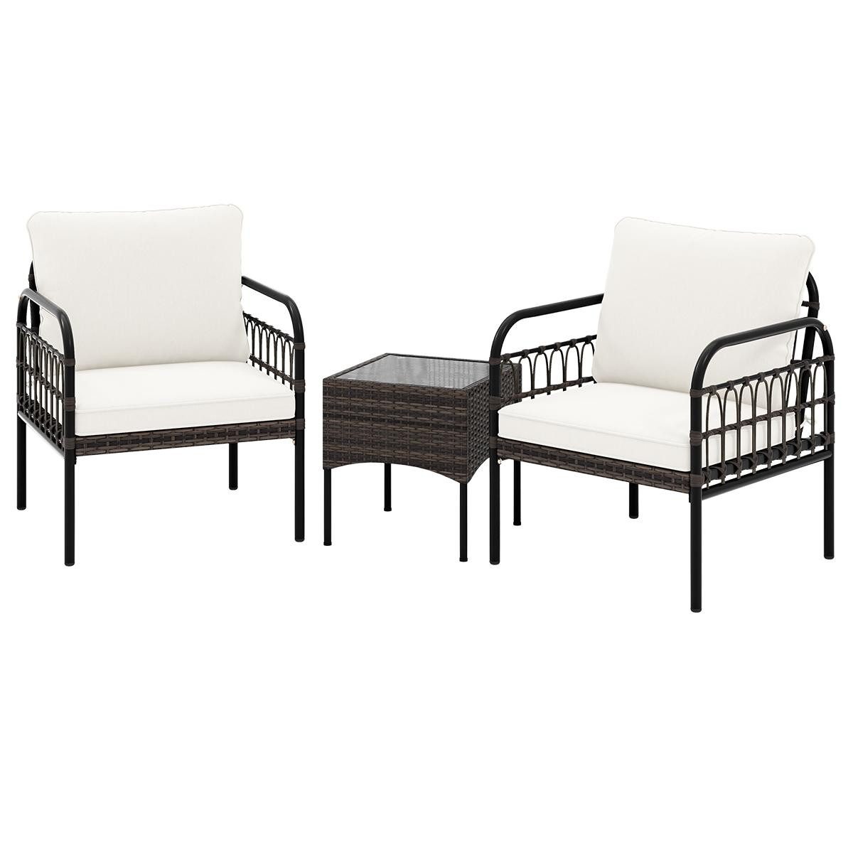 Erhöhen Sie Ihr Outdoor-Erlebnis mit unserem 3-teiligen Terrassen-Set, das für Komfort und Langlebigkeit konzipiert wurde. Mit gebogenen Armlehnen und hohen Rückenlehnen bietet dieses Set festen Halt für Ihren Körper, während das hochwertige PE-Rattan-Material und der stabile Metallrahmen eine lang anhaltende Haltbarkeit. Das moderne Rattan-Design fügt sich mühelos in verschiedene Outdoor-Dekorationen ein und schafft eine stilvolle Sitzgelegenheit für Ihre Terrasse, Ihren Patio oder Ihren Garten. Dieses Terrassen-Set ist die perfekte Wahl, um einen gemütlichen und einladenden Outdoor-Rückzugsort zu schaffen.