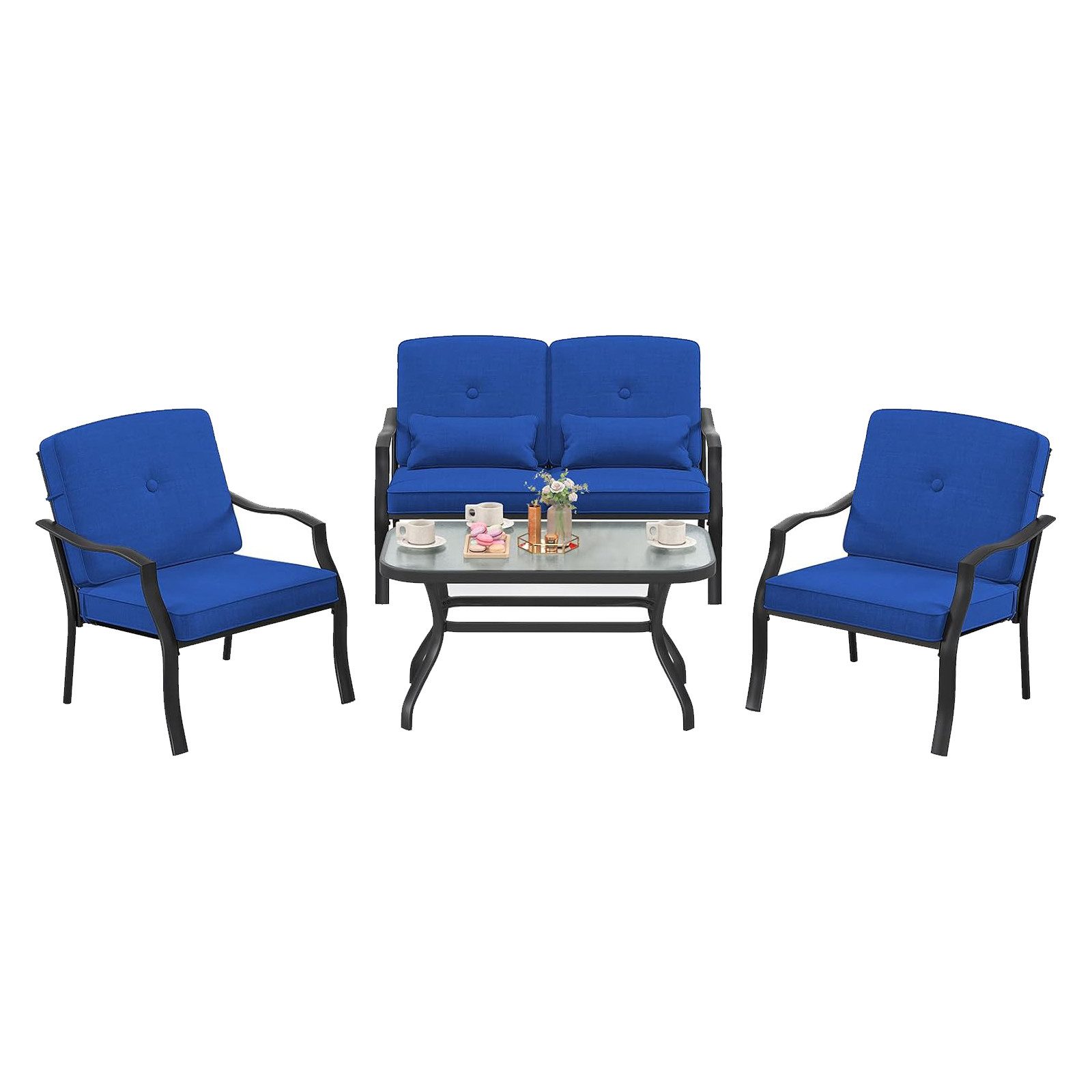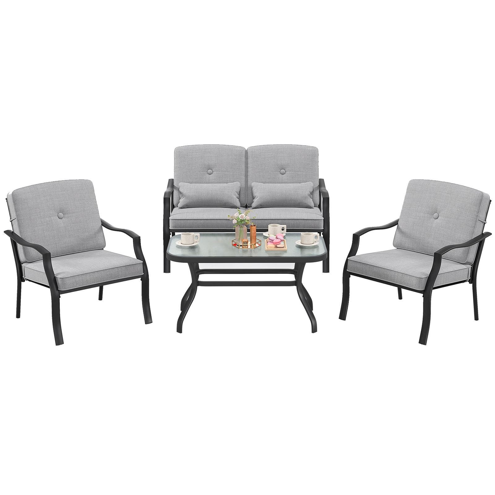 Genießen Sie Ihre Freizeit im Freien mit unserem 4-teiligen Gartenmöbel Set! Bestehend aus einem Couchtisch, einer Gartenbank und 2 Einzelstühlen bietet es Platz für 4 Personen, um angenehme Versammlungen zu genießen. Dank der leicht geneigten Rückenlehne, geschwungenen Armlehnen und weich gepolsterten Sitz- und Rückenkissen bietet das Gartenlounge Set hohen Sitzkomfort. Zusätzlich sind 2 Lendenkissen für noch mehr Bequemlichkeit enthalten. Der abnehmbare Kissenbezug mit Reißverschluss ermöglicht eine leichte Reinigung. Die Tischplatte aus gehärtetem Glas verleiht dieser Garten Sitzgruppe eine elegante Note und ist auch von hochwertiger Qualität. Getragen von einem rostschutzpulverbeschichteten Metallrahmen ist das Gartenlounge Set witterungsbeständig, formstabil und langlebig im Außenbereich. Eine ideale Bereicherung für Ihren Außenbereich - sichern Sie sich dieses Lounge Set jetzt und gönnen Sie sich entspannte Stunden im Freien!