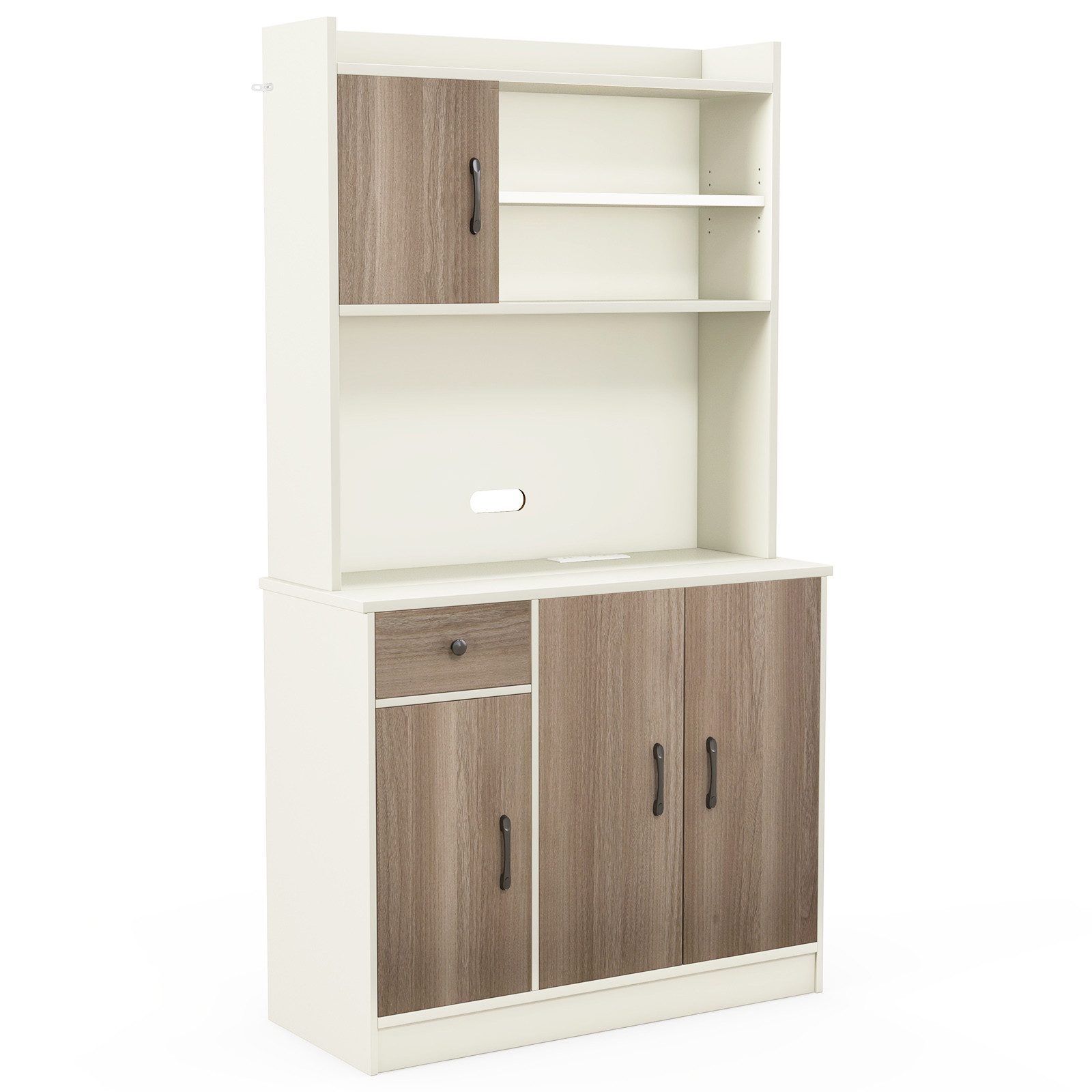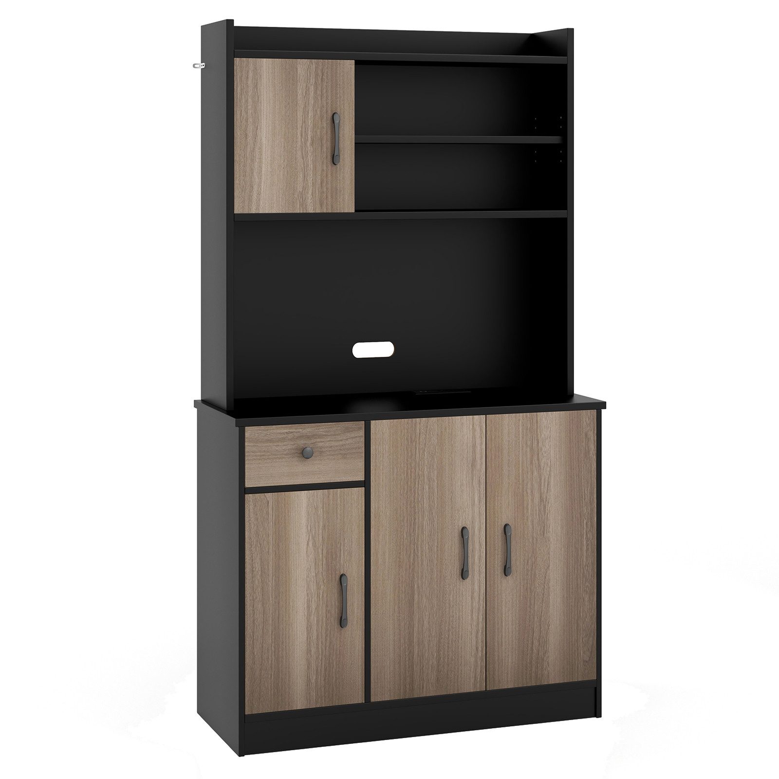 Beschreibung: Verabschieden Sie sich von Unordnung und genießen Sie einen organisierten Raum mit unserem Küchenschrank mit Ladestation! Unser freistehender Vorratsschrank bietet 3 Schränke und mehrere offene Regale, die Ihnen viel Stauraum für Ihre Küchenutensilien bieten. Ob Sie Töpfe, Pfannen, Geschirr oder kleine Geräte aufbewahren möchten, die 4 verstellbaren Regale ermöglichen es Ihnen, den Stauraum nach Ihren Bedürfnissen anzupassen. Die eingebaute Ladestation sorgt dafür, dass Ihre Geräte immer aufgeladen und erreichbar sind. Um die Sicherheit zu erhöhen, ermöglicht das Kippschutzkit das Befestigen des Schranks an der Wand. Sie können diesen vielseitigen Schrank als Küchenvorratsschrank, Buffet-Seitenboard oder Kaffeebar-Schränkchen nutzen.
