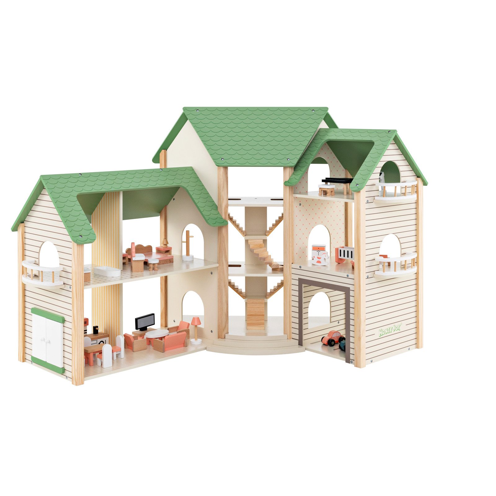 Lieferumfang | 1 x Puppenhaus aus Holz 36 x Zubehörteile 1 x Anleitung |