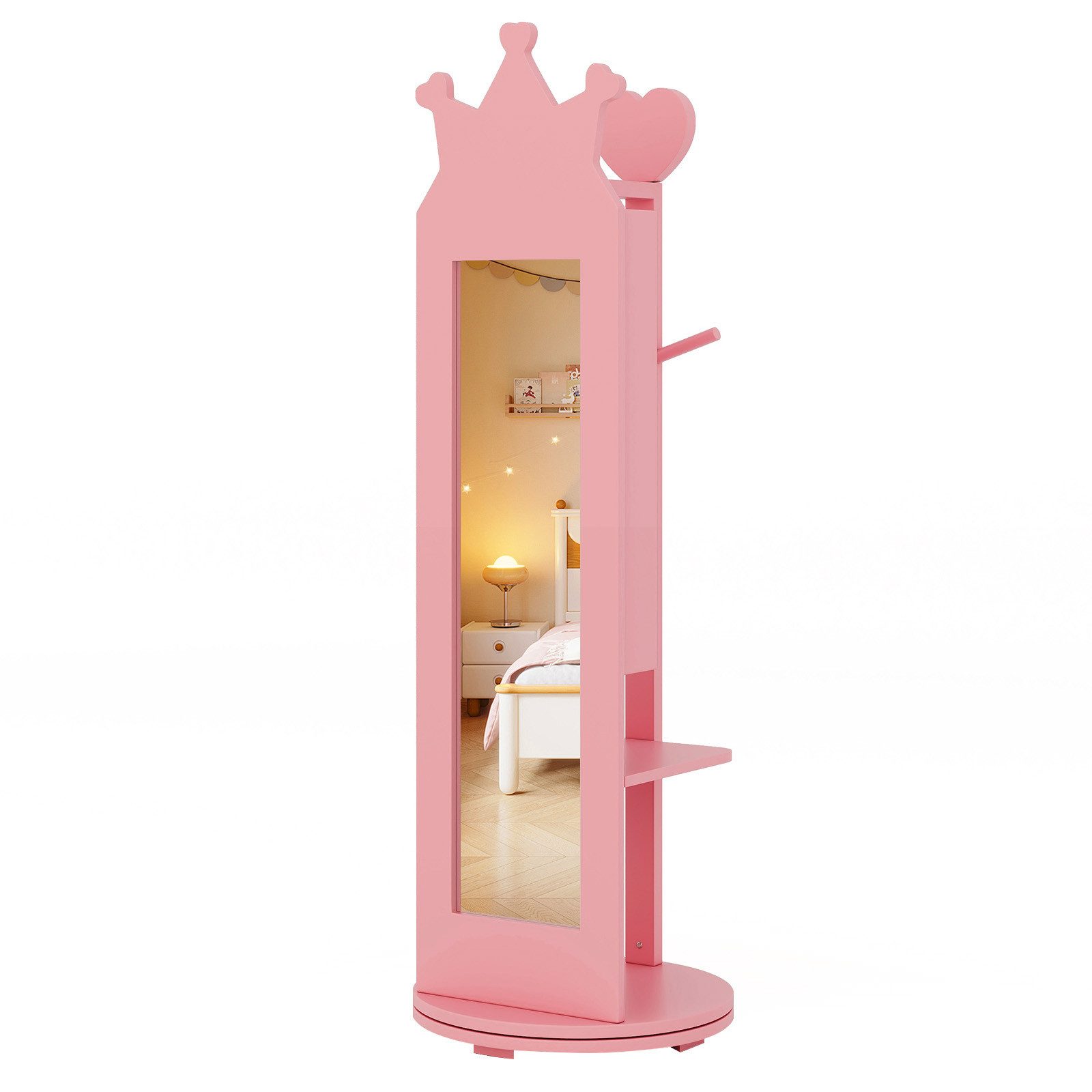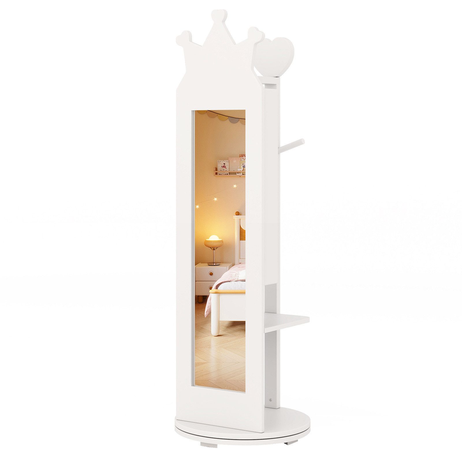 Belohnen Sie Ihre kleine Prinzessin mit ihrem eigenen Schmuckschrank! Die Kronenform oben wird für Ihr Kind Grund genug sein, sich zu verlieben. Der klare Ganzkörperspiegel bietet Ihrer Kleinen eine Ansicht von Kopf bis Fuß. Außerdem verfügt er über 35 Ringschlitze, 3 Ablageflächen, 2 Haken und 2 untere Ablageflächen. Kinder können ihren Schmuck, Nagellack, ihre Kleidung und ihr Spielzeug je nach Bedarf aufbewahren. Der um 360° drehbare Sockel erleichtert das Drehen des Ständers. Um ihn sicher und stabil zu halten, verfügt der stehende Schmuckschrank außerdem über eine Kippsicherung und stabile Beine.