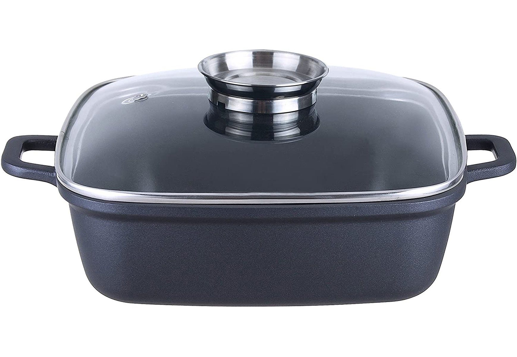 Viereck-Bräter aus robustem Aluguss mit Aromaknopfdeckel und hochwertiger Greblon®-Keramikbeschichtung