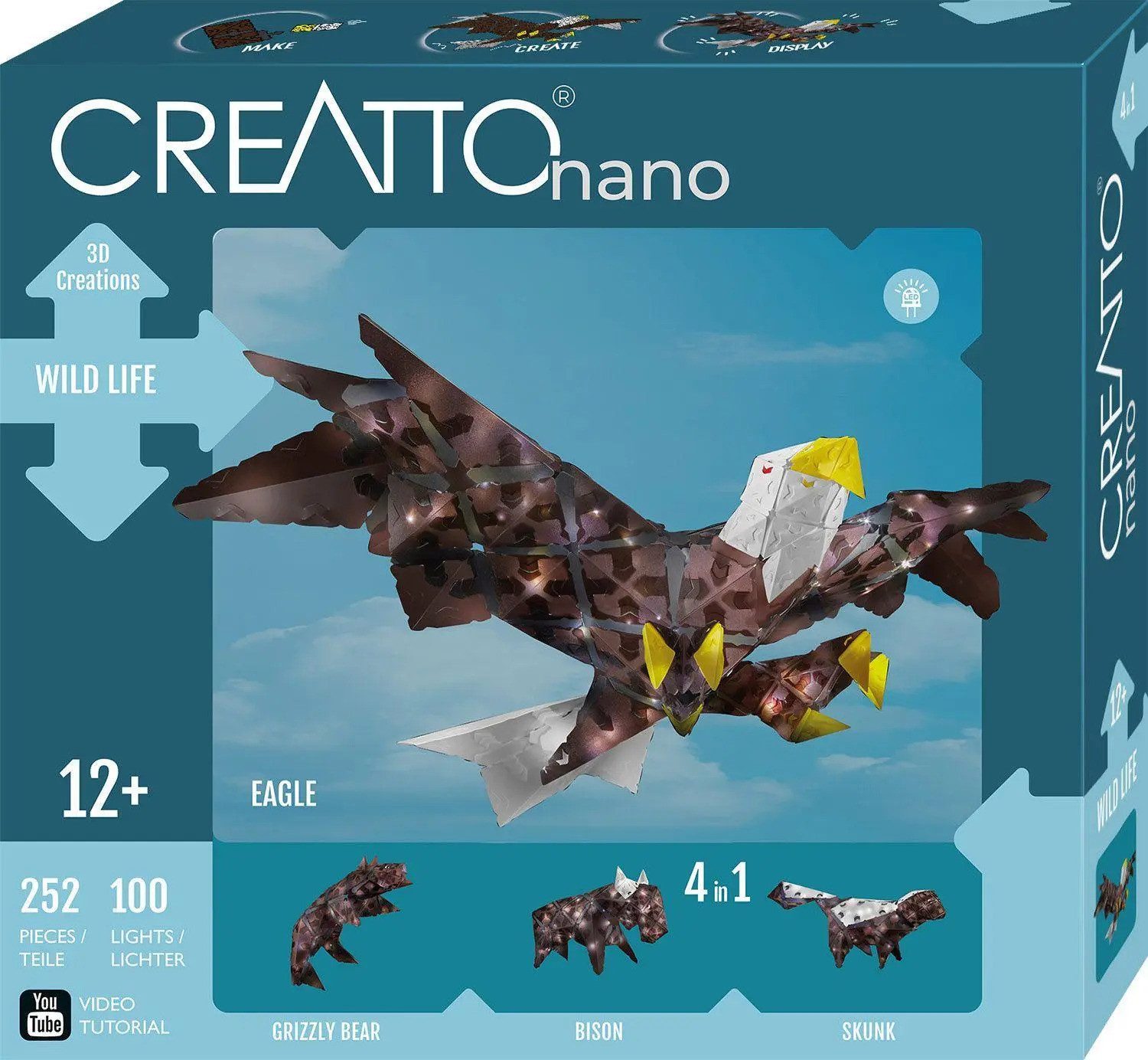 Einzigartig! Mit dem 3D-Puzzle von CREATTO individuelle 3D-Leuchtfiguren entwerfen: Nachtlicht und Deko in einem! Ausführliche Schritt-für-Schritt Anleitung: In gedruckter Form oder mit dem Videotutorial die Modelle Adler, Grizzly, Bison oder Stinktier zusammenbauen. Durch die Kombination der bewährten großen CREATTO-Steckteile mit den kleineren nano-Teilen gelingen große raumgreifende Modelle mit feinen Details. Ideales Bastelset für die ersten Schritte in das dreidimensionale Bauen: Förderung von Konzentration, Feinmotorik und der räumlichen Vorstellungskraft. Die flexiblen Kunststoffteile können durch einfaches Falten und Verbinden zu verschiedenen Kreationen zusammengepuzzelt werden. Das perfekte Geschenk für 3D-Puzzle- und Bastel-Fans oder Naturliebhaber ab 12 Jahren. Tolle Aktion: mit Freunden, Geschwistern und Eltern zuhause basteln. Der König der Lüfte breitet seine mächtigen Schwingen aus! Dieses Bastelset kombiniert clever die bewährten größeren CREATTO-Puzzleteile mit den neuen kleineren nano-Steckteilen und ermöglicht es so, raumgreifende 3D-Modelle mit feinen Details zu bauen und mittels beiliegender LED-Lichterkette zum Leuchten zu bringen. Adler, Bison, Grizzly oder Stinktier bringen die Wildnis Amerikas ins Wohnzimmer und wecken das Fernweh. Für den Aufbau stehen neben der gedruckten Schritt-für-Schritt-Anleitung auch Online-Aufbauvideos zur Verfügung. So gelingt das Lieblingsmodell bestimmt. Großer 3D-Puzzle-Spaß, DIY-Projekt und tolles Geschenk für Wild-Life-Fans ab 12 Jahren!