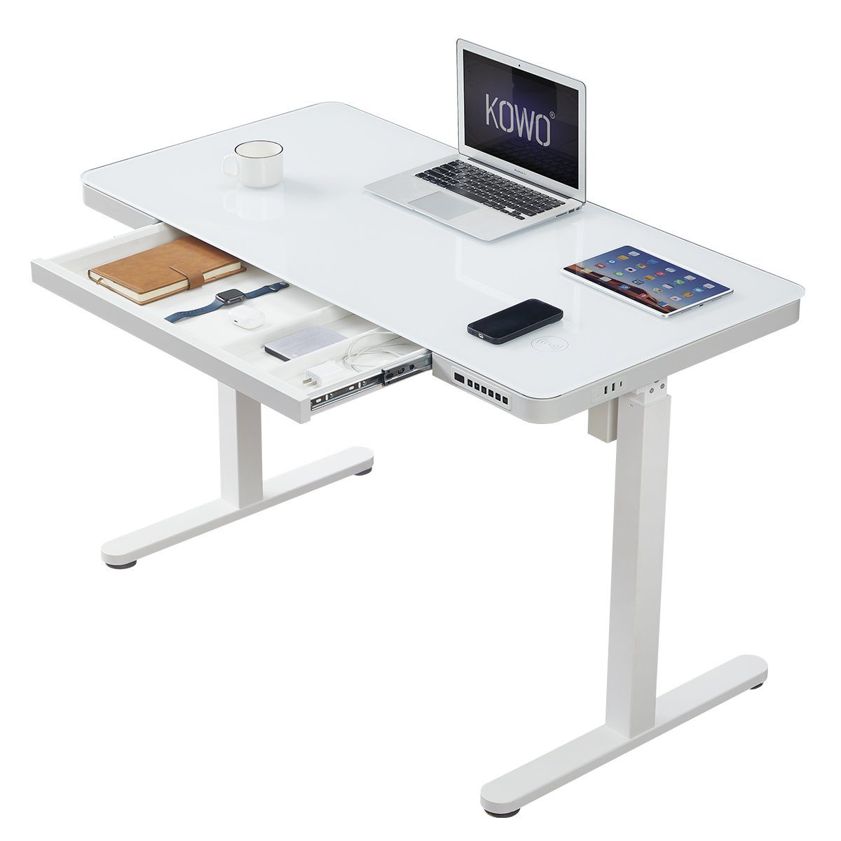 Technische Daten: Farbe: Glas-Weiß Material: Glas, Holzspanplatte, Metall Größe: 60 x 120 x (75-120) cm (T x B x H) Dicke der Glas: 0,6 cm Höhe der Schublade: 4 cm Max. statische Belastbarkeit: 50 kg Niedriger Geräuschpegel: unter 50 dB Hubgeschwindigkeit: 25 mm/s Speicher-Schnellwahltasten: 3 Stück