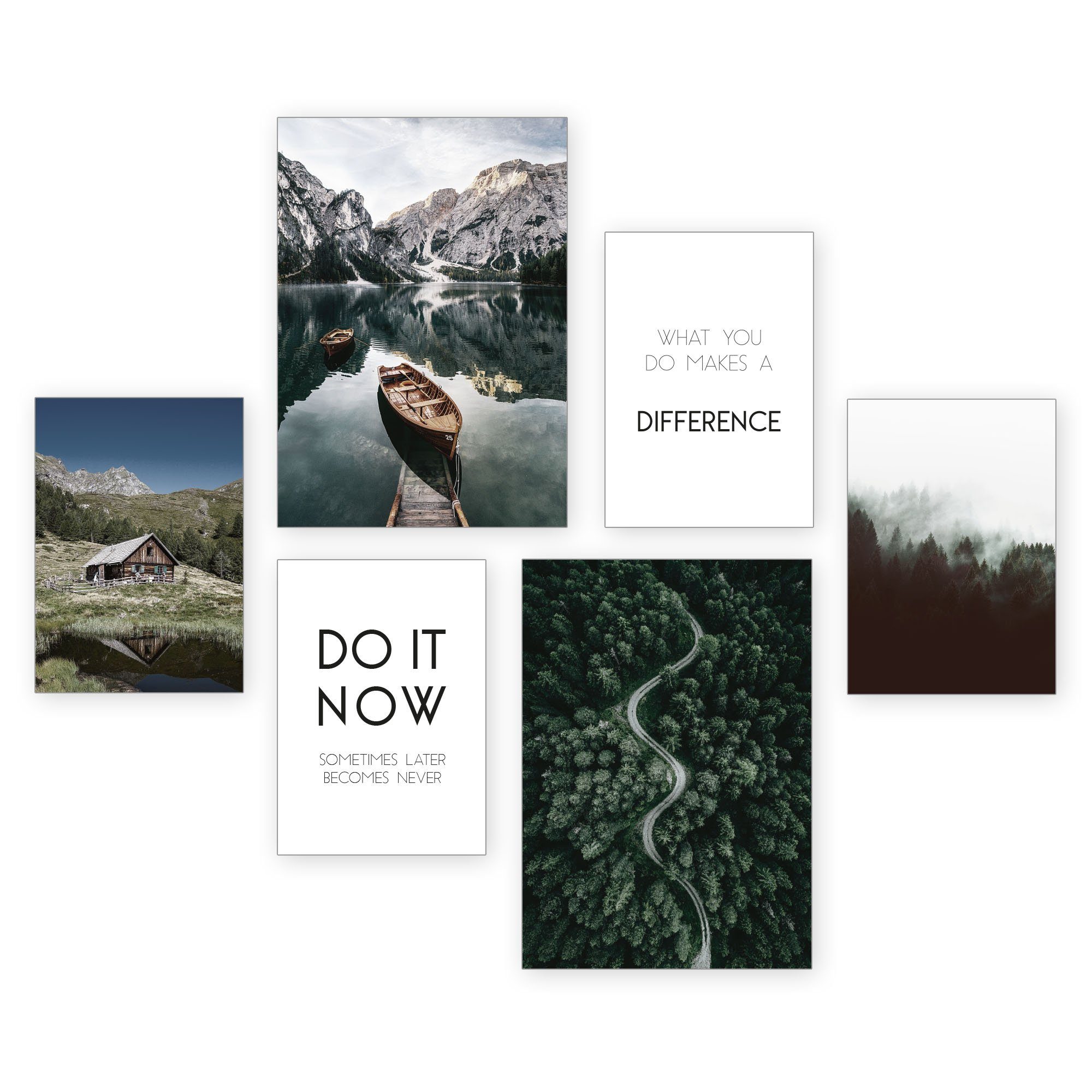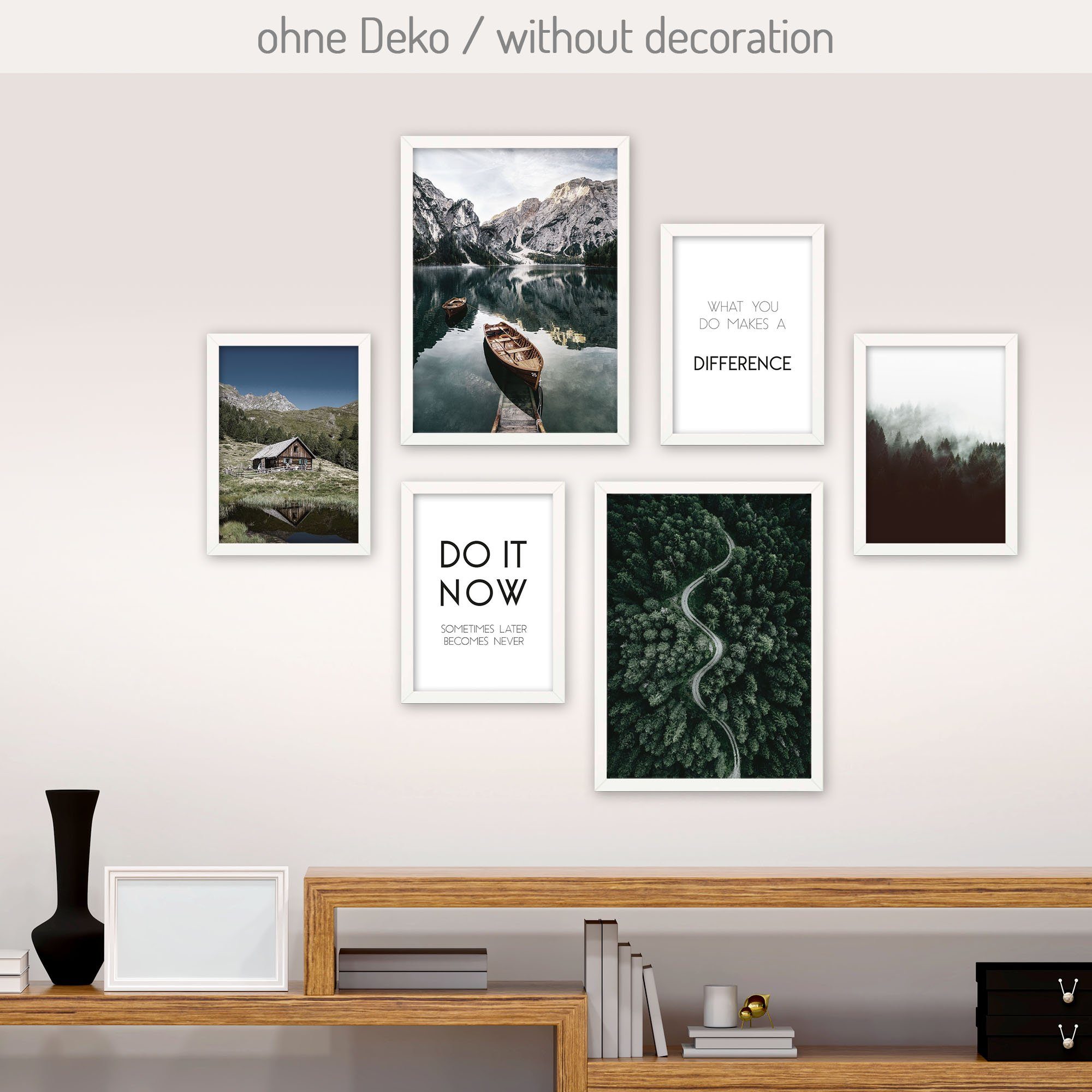 Wohne mal anders! Schluss mit langweiliger Wanddeko! Mit unserem 6-teiligen Poster-Set hebst du dich ab, denn neben den schönen Motiven bringt unsere Posterwand auch passende Sprüche in stilvoller Schriftart mit. Wir legen Wert auf hohe Qualität: Unsere Kunstdrucke mit brillanten Farben werden ausschließlich auf hochwertigem 250g/m² schweren Qualitätspapier gedruckt, damit Sie lange Freude an Ihren Wandbildern haben und diese ein einzigartiges Flair in die Wohnung bringen. Mit diesem Qualitätsprodukt kaufen Sie auch "Made in Germany". Das Set beinhaltet 2 Poster in DIN A3 (29,7 x 42 cm) sowie 4 Poster in DIN A4 (21 x 29,7 cm). Sie können die Poster entweder ohne Rahmen bestellen oder aber auch schöne Echtholzrahmen auswählen, die farblich zu Ihrer Einrichtung passen. Wir bieten die Rahmen in Schwarz, Weiß oder Naturfarben an. Die auf den Produktfotos gezeigte Bilderanordnung nimmt etwa eine Fläche von 115 x 90 cm ein. Natürlich können die Bilder auch nach Lust und Laune kombiniert werden. Nutzen Sie Ihre gewünschten Bilderrahmen individuell, um ein ganz persönliches Wandbild zu zaubern. Die Posterwand ist die perfekte Deko für Ihr Wohnzimmer, Flur, Diele, Küche, Büro oder Schlafzimmer und ebenso eine ausgefallene Geschenkidee. Viele der Motive können gut kombiniert werden.