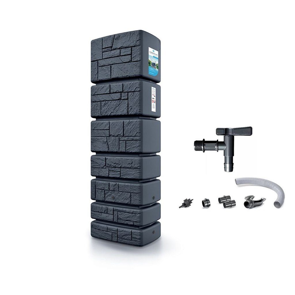 Großvolumige Wassertonne aus robustem Kunststoff (PP) in ansehnlicher, toller Stein Optik! Die hochwertige Optik in einem schlicht gehaltenem Anthrazit passt gut zu den Trends der modernen Architektur. Das Regenfass verfügt über eine obere Öffnung mit einem Deckel, vier Befestigungspunkte für das Abflussrohr der Dachrinne und zwei Gewindelöcher für einen Wasserhahn oder eine Schnellkupplung für die Montage eines Gartenschlauchs. Super praktisch: Diese Regentonne wird mit einem praktischen Befüllsystem geliefert. Mit dem Set können Sie die Wassertonne im Handumdrehen an gängige Fallrohre anschließen. Darüber hinaus kommt jede Wassertonne mit einem Wasserhahn mit Mutter und O-Dichtungring. Der Wassertank ist mit einem Volumen von ca. 350 Liter bestens geeignet zur Verwendung im Garten, Terrassen, sowie an / hinter dem Haus. Das robuste Kunststoffmaterial ist abwaschbar und leicht zu reinigen. Aufgrund der robusten Ausführung des Materials der Tonne kann diese ganzjährig draußen platziert werden. Das Material ist UV-, Witterungs- und Frostbeständig. Empfohlen wird jedoch, das Fass nicht in komplett gefüllten Zustand überwintern zu lassen, sondern das Wasser zum größten Teil ablaufen zu lassen. Wichtiger Hinweis: Der Hersteller empfiehlt, die Regentonne nicht unmittelbar an der Wand zu platzieren, da die Regenfässer bei vollständiger Befüllung sich oben etwas ausbeulen könnten. Der empfohlene Mindestabstand beträgt ca. 30 cm.