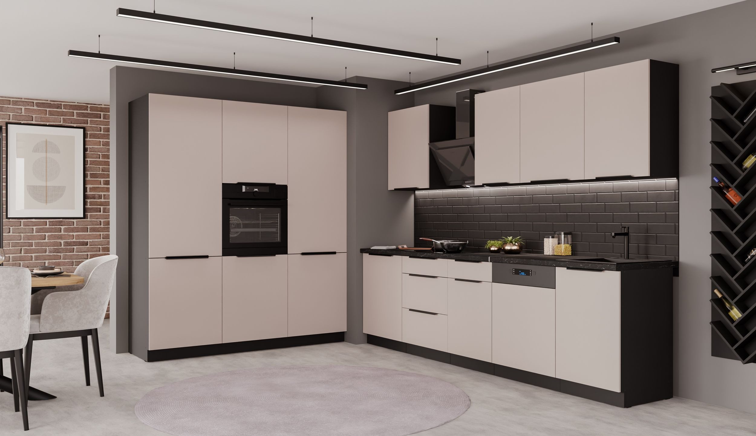 Die vielseitige Küche ARONA im modernen Mix aus der neuen Trendfarbe Kaschmir beige matt und schwarz matt, ist ein wahres Kombinations- und Stauraumwunder, in dem alle ihre Küchenutensilien Platz finden. Das edle Design und die gute Verarbeitung tun ein Übriges, um aus ihrer Küche eine Wohlfühloase zu machen. Всі Türscharniere und Schubladen sind mit hochwertigen Dämpfern, für leises Сховати der Fronten ausgestattet.