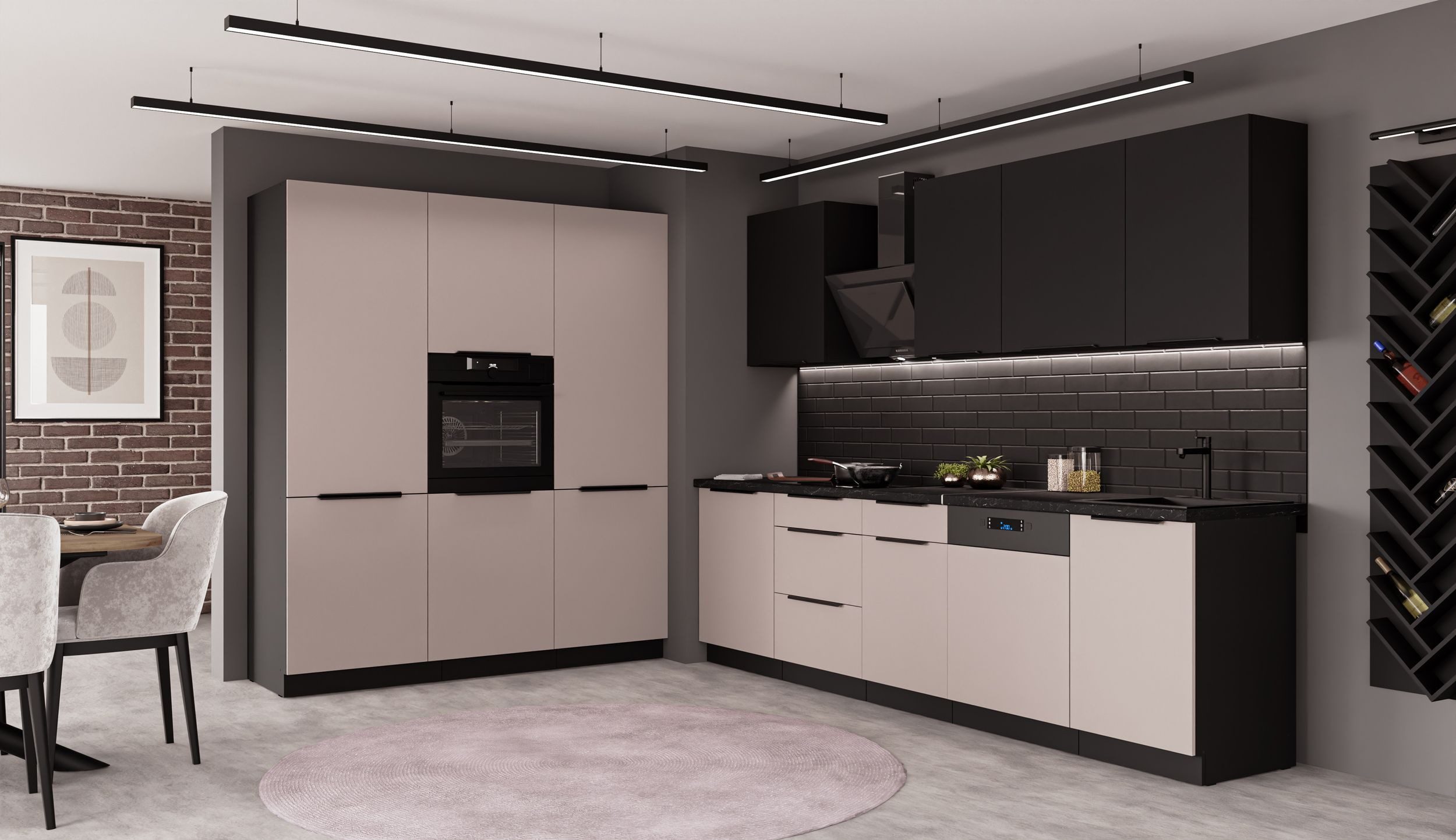 Die vielseitige Küche ARONA + SIENA im modernen Mix aus der neuen Trendfarbe Kaschmir beige matt und schwarz matt, ist ein wahres Kombinations- und Stauraumwunder, in dem alle ihre Küchenutensilien Platz finden. Das edle Design und die gute Verarbeitung tun ein Übriges, um aus ihrer Küche eine Wohlfühloase zu machen. Всі Türscharniere und Schubladen sind mit hochwertigen Dämpfern, für leises Сховати der Fronten ausgestattet.
