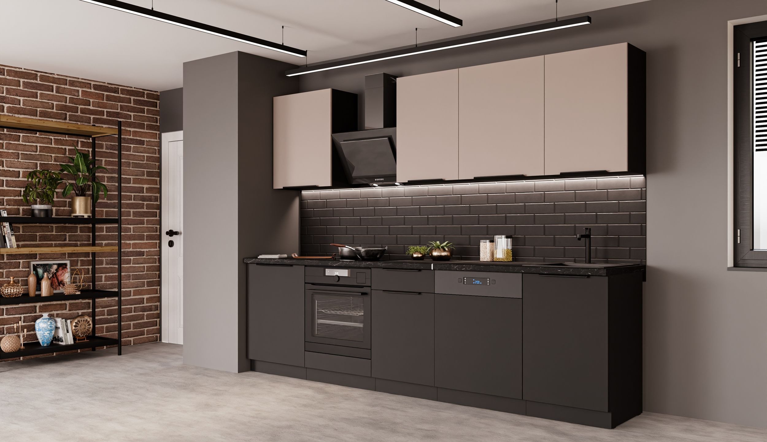 Die vielseitige Küche SIENA + ARONA im modernen Mix aus der neuen Trendfarbe Kaschmir beige matt und schwarz matt, ist ein wahres Kombinations- und Stauraumwunder, in dem alle ihre Küchenutensilien Platz finden. Das edle Design und die gute Verarbeitung tun ein Übriges, um aus ihrer Küche eine Wohlfühloase zu machen. Всі Türscharniere und Schubladen sind mit hochwertigen Dämpfern, für leises Сховати der Fronten ausgestattet.
