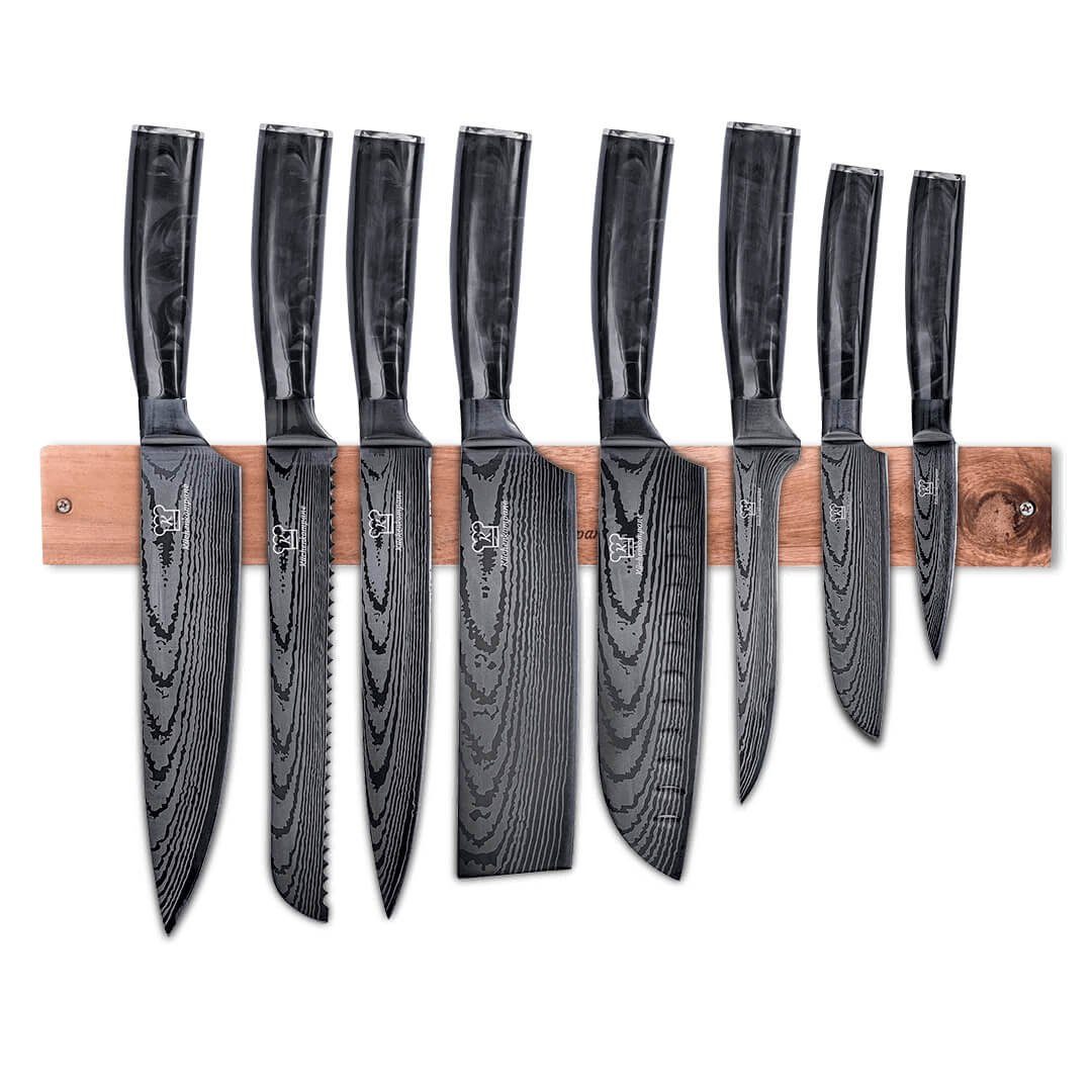 Jedes Messer kannst du auf der mitgelieferten magnetischen Holzleiste sicher vor Beschädigung aufbewahren.