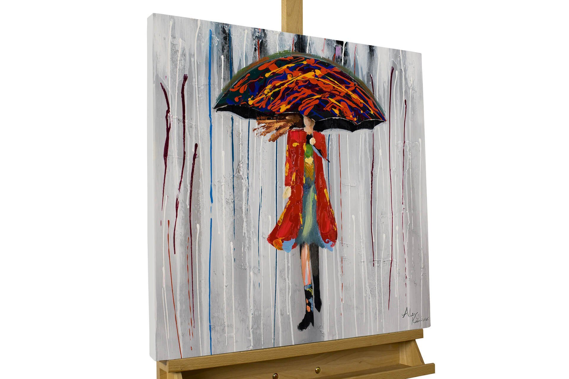 'Alice im Regen' leuchtet in Rot gekleidet durch ihre graue Umgebung. Das Mädchen in diesem Acrylbild steht für Individualität im manchmal tristen Alltag – wo außer in uns könnten wir sonst Farbe finden? Der Künstler hat den Regenschirm mit Kunststoffelementen unterlegt, um einen 3D-Effekt zu erzeugen.