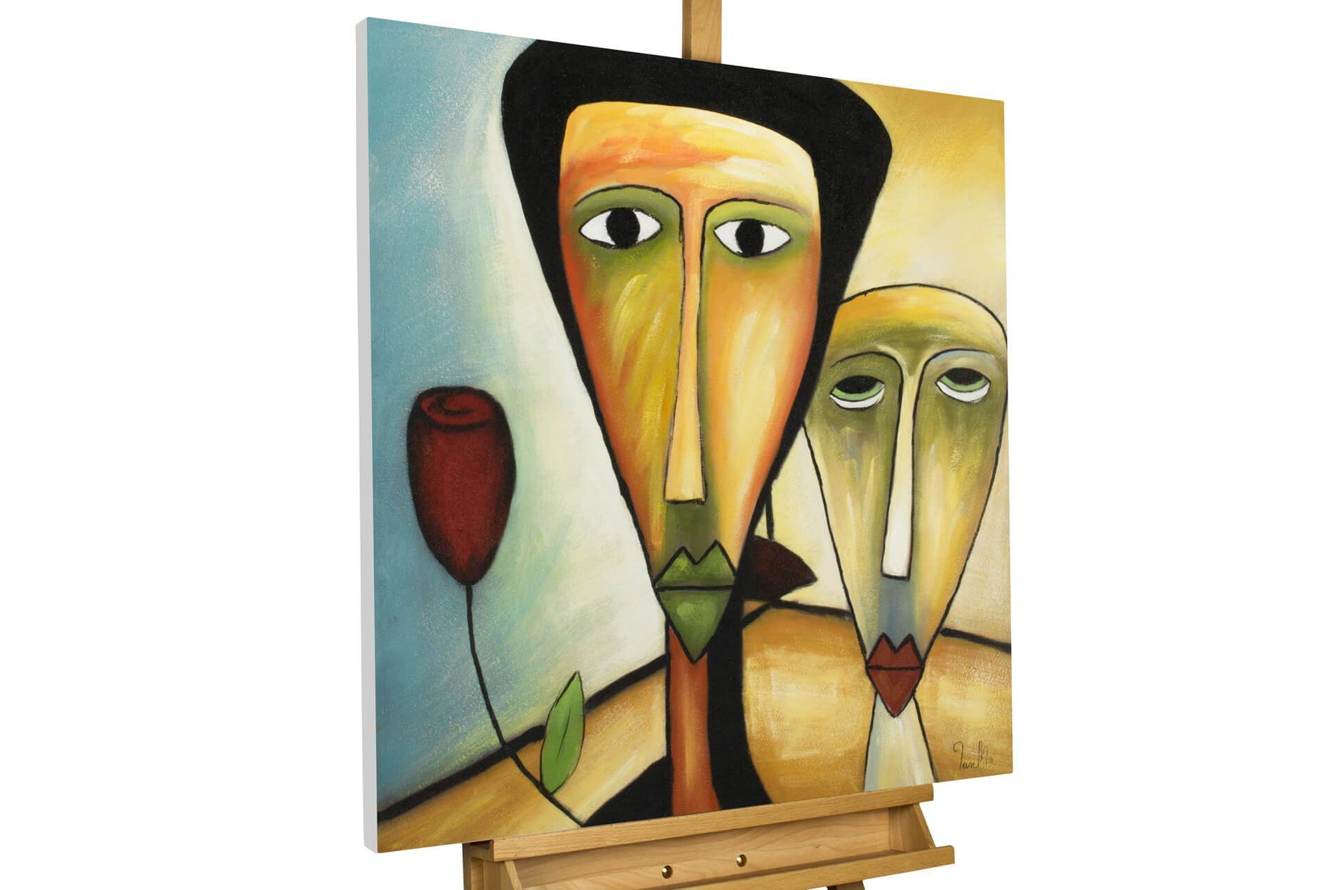 Das abstrahierte Liebespaar auf dem glanzvollen Acrylgemälde 'Amorous Walk' in Blau und Gelb verströmt eine ruhige Sinnlichkeit, die sich unmittelbar auf die Atmosphäre Ihres Wohnzimmers überträgt. Voller Zärtlichkeit beglückt der Mann seine Geliebte mit einer Rose – pure Romantik auf dem handgemalten Bild, das auch Ihre Gäste überzeugen wird.