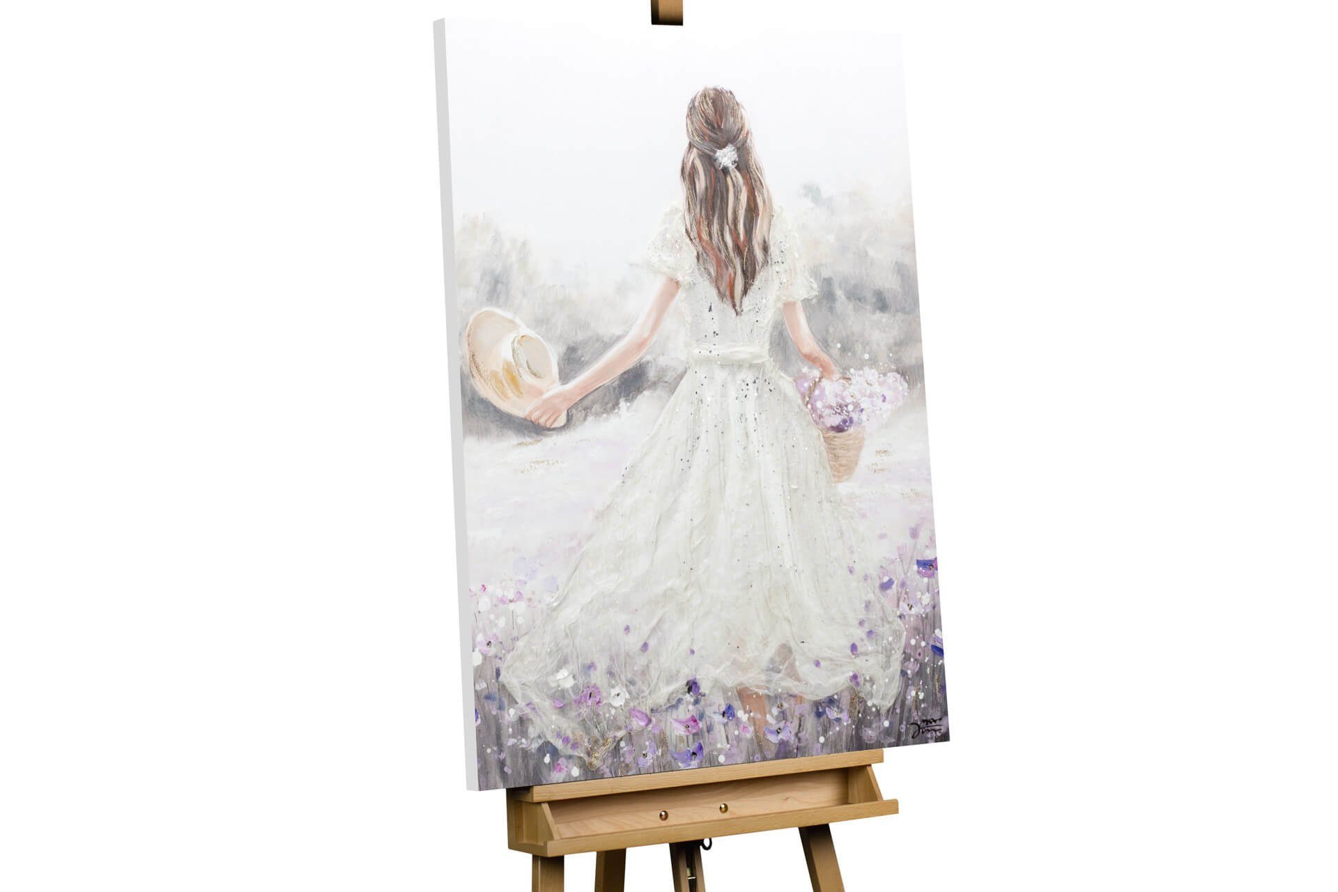 Man nennt sie das 'Blumenmädchen', eine handgemalte Dame von exquisiter Eleganz, die durch einen Blütenmeer in Lila spaziert. Ihr Kleid in Weiß erinnert an die Reinheit der Natur, die sie umgibt. Dieses Acrylgemälde mit Mixed-Media-Elementen verwandelt Ihren Flur in einem Ort zum träumen: von den Duft der Blumen und die feine Brise, die sie umarmt.