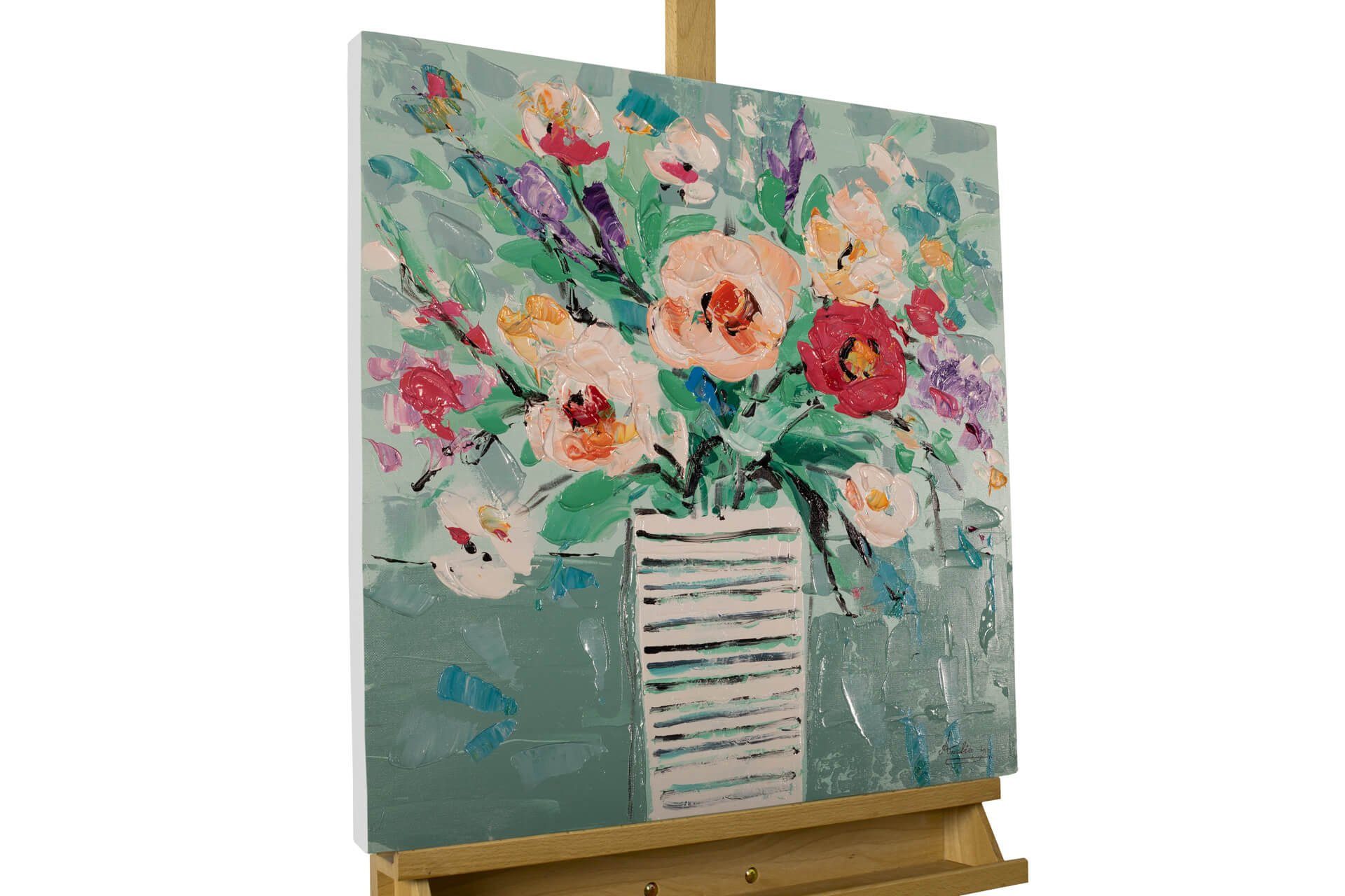 Versprühen Sie mit dem 'Bouquet der Freude' eine harmonische Atmosphäre und Heiterkeit in ihrem Wohnzimmer. Die bunten Farben mit den Akzenten in Blau und das handgemalte Motiv des Blumenstraußes wecken täglich positive Erinnerungen an den Sommer. Dekorieren Sie Ihr Heim mit diesem Acrylgemälde und lassen Sie schöne Momente Revue passieren.