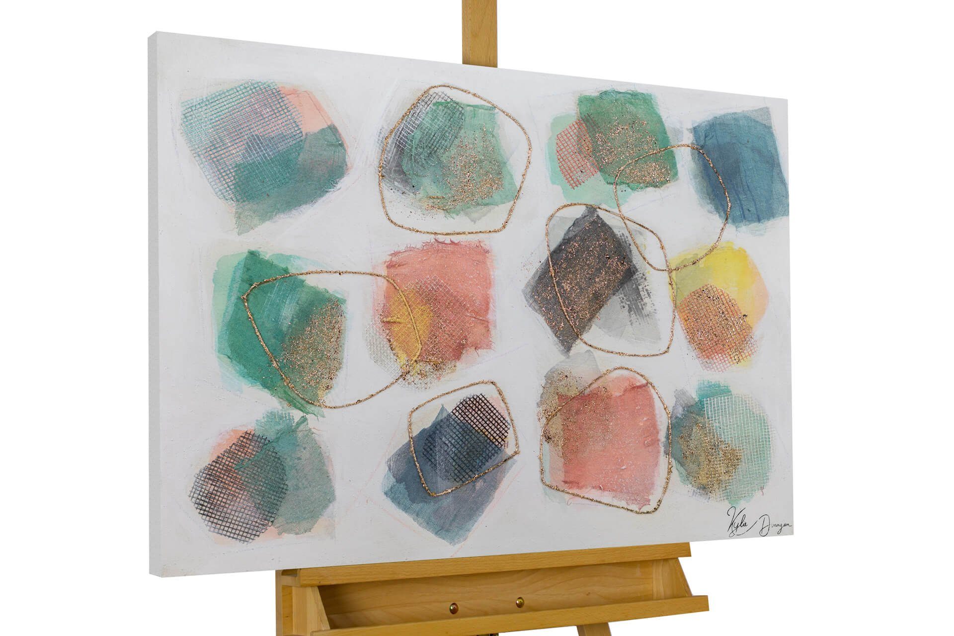 Auf dem Acrylgemälde ordnen sich Pastellfarben in abstrakten Formen an. Diese ergänzen sich teils durch handgemalte Umrandungen in Goldglanzeffekt sowie dezenten Mixed-Media-Elementen und bilden ein 'Buntes Zusammenspiel'. Gekonnt bilden sich Kontraste aus warmen und kalten Farben, die ein Bild kreieren, das in Ihrer Praxis in Erinnerung bleibt.