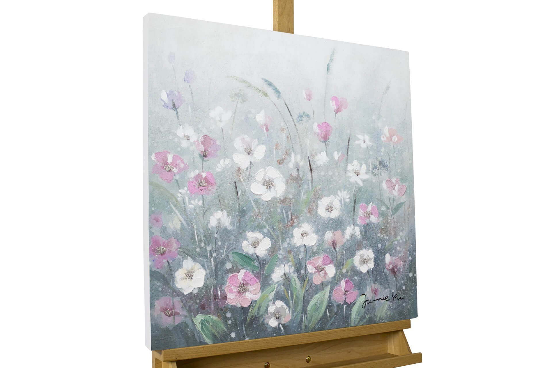 Ein zartes Meer aus weißen Blüten dominiert das zauberhafte Acrylgemälde 'Flowery Meadow'. Das handgemalte Bild in Grau überzeugt mit Feingefühl und einem weichen Farbschema, das sich in vornehmer Назадhaltung übt. In Ihrem Esszimmer kreiert das Kunstwerk mit Glitter eine angenehme Atmosphäre, in der Sie und Ihre Gäste sich wohlfühlen werden.