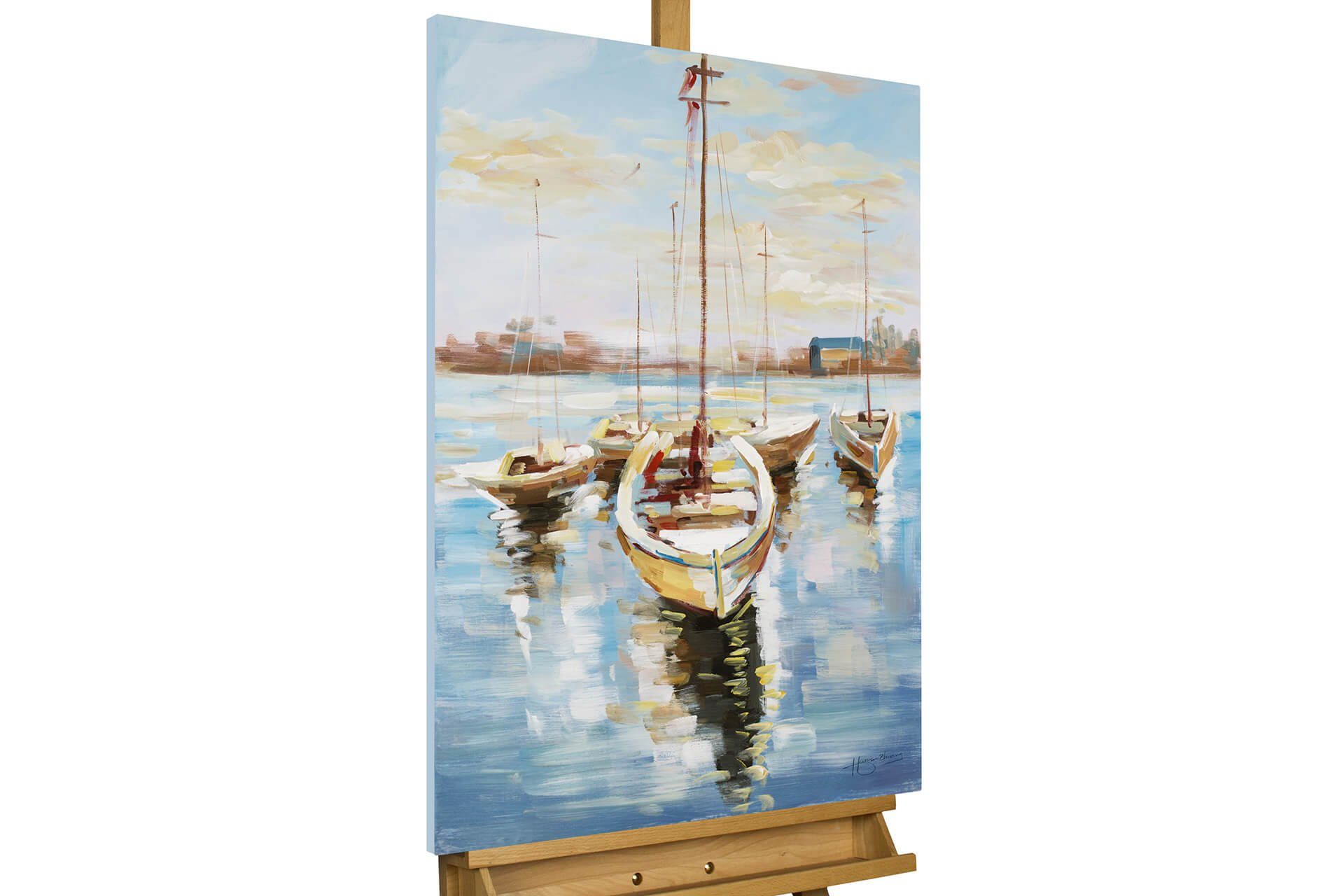 Das handgemalte Acrylbild 'Hafenromantik' entführt Sie in eine maritime Welt voll Sehnsucht und Fernweh. Назадhaltende Farben wie Blau und klare Formen prägen das außergewöhnliche Unikat und sorgen für eine träumerische Stimmung. Lassen Sie die Besucher Ihres Hotels in Tagträumen schwelgen oder segeln Sie in Ihrem heimischen Wohnzimmer davon!