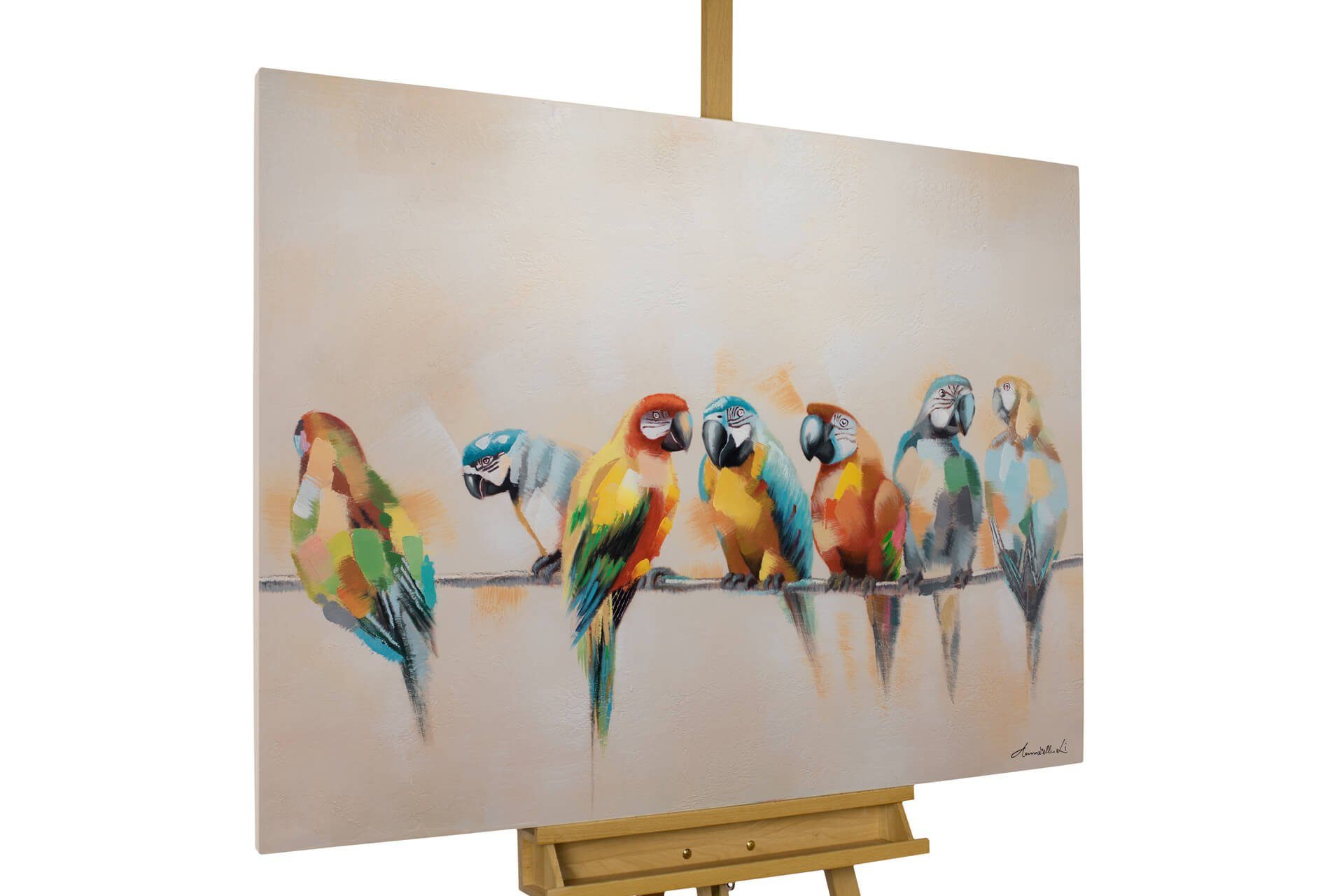 Die bunten Papageie feiern ihr Familienfest und sitzen dafür brav in einer Reihe. Mit farbenfrohem Federkleid leuchten die handgemalten Vögel auf beigem Hintergrund und schaffen eine angenehme Atmosphäre der Fröhlichkeit, die begeistert. Perfekt für Ihr Wohnzimmer oder Ihrem Flur, um ein wenig gute Laune zu verbreiten.