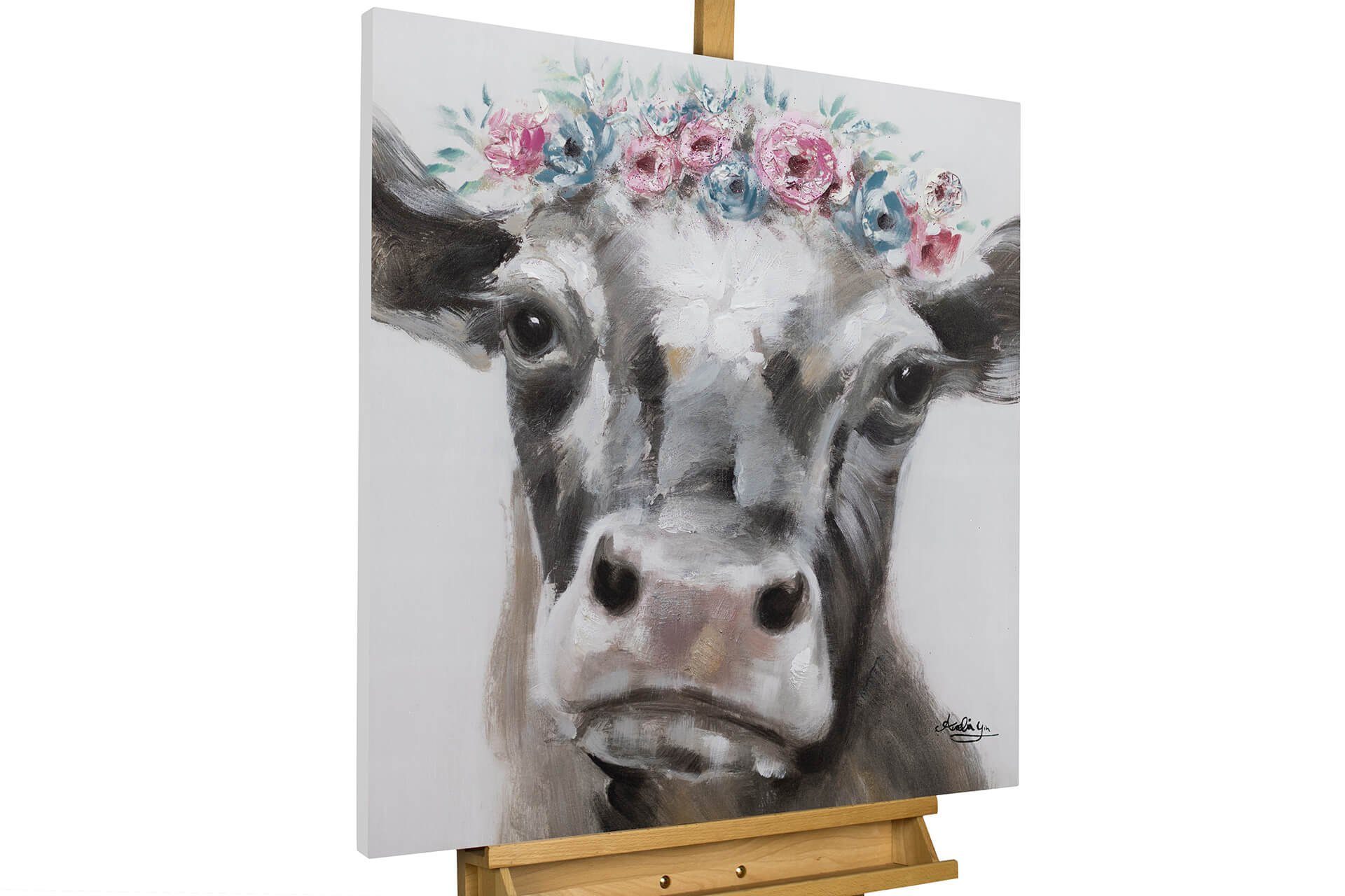 Auf dem mit Mixed-Media-Elementen und Glitter verzierten Acrylgemälde 'Love, Peace & Muh' streckt Ihnen eine Kuh mit rosa Blumen auf dem Kopf ihre Schnauze entgegen. Die treuen Augen in Braun zeigen die Gutmütigkeit des Tiers und erfüllen Ihr Wohnzimmer mit Geborgenheit. Schmücken Sie Ihr Zuhause mit einem handgemalten Bild der besonderen Art.