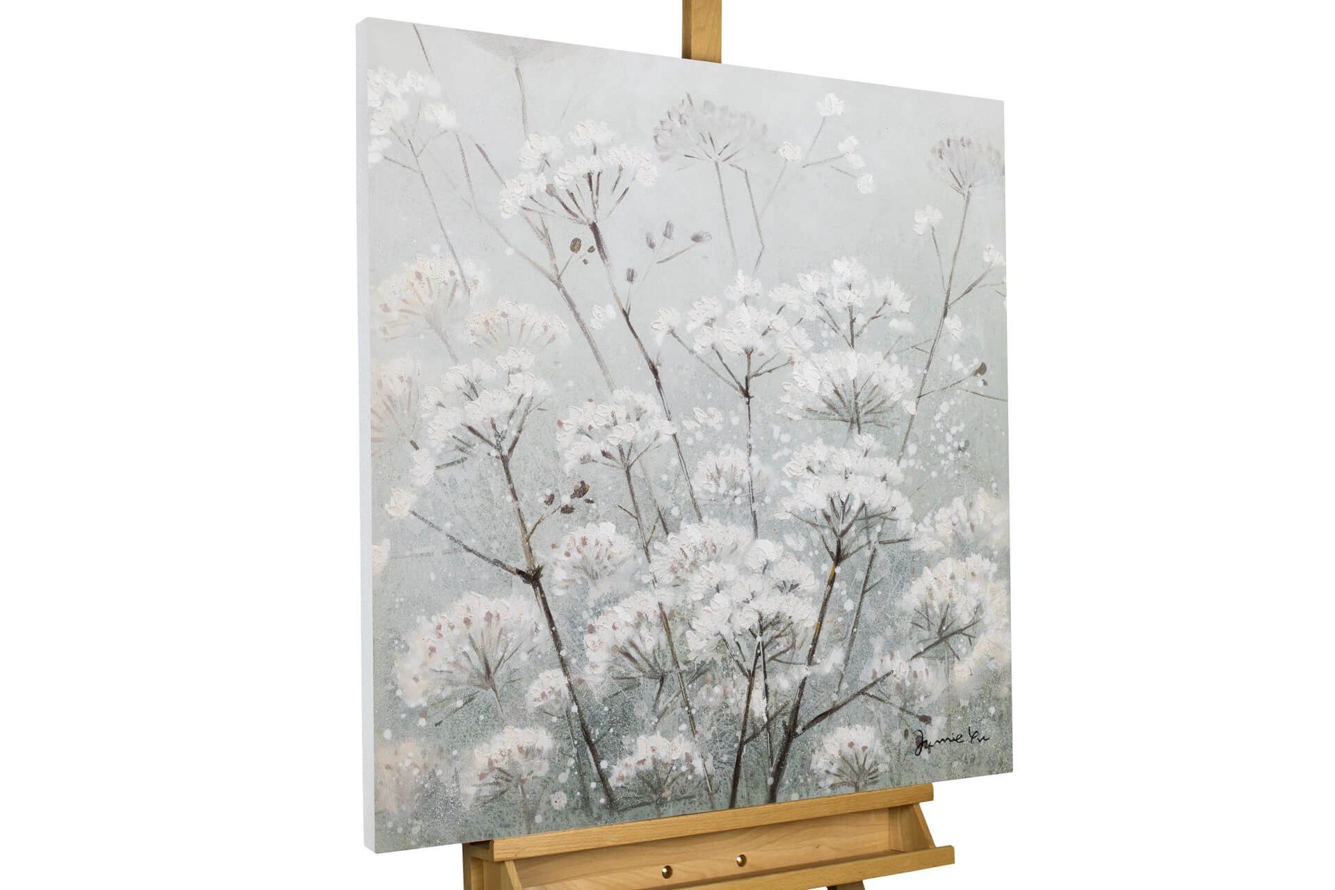 Weiße 'Nebelblüten' werden von grauem Dunst umgarnt und versprühen voller Feingefühl eine wilde Romantik. Verschönern Sie Ihr Zuhause mit einem handgemalten Kunstwerk der Extraklasse! In Ihrem Schlafzimmer präsentiert sich Ihnen das traumhafte Motiv mit Glitter in seiner zauberhaften Pracht und wiegt Sie tagtäglich aufs Neue sanft in den Schlaf.