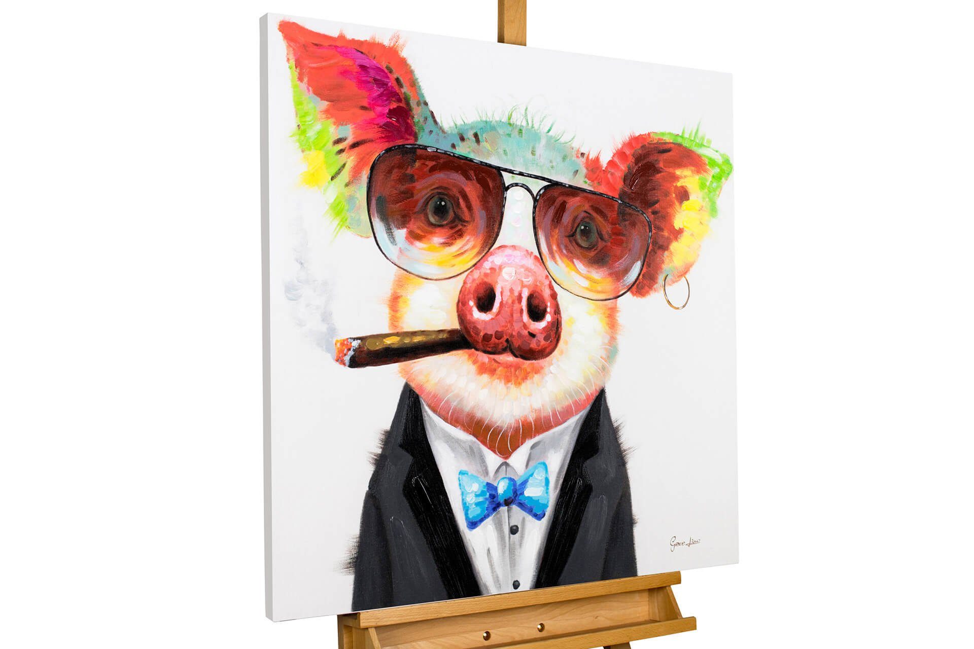 Betrachtet man die bunten, neonfarbenen Ohren des adretten Schweinchens, könnte man meinen, sie glühten vor Lebenslust. Davon kann man bei dem handgemalten Acrylbild 'Smoking Hot Bacon' auch ausgehen. Stil hat das Schwein alle mal. Fliegerbrille auf dem Rüssel, schicken Ring im Ohr und Zigarre im Mund. Da darf der feine Zwirn natürlich nicht fehlen. Всіs in allem eine ungewöhnlich witzige Erscheinung, die Ihnen immer wieder ein Lächeln aufs Gesicht zaubert.