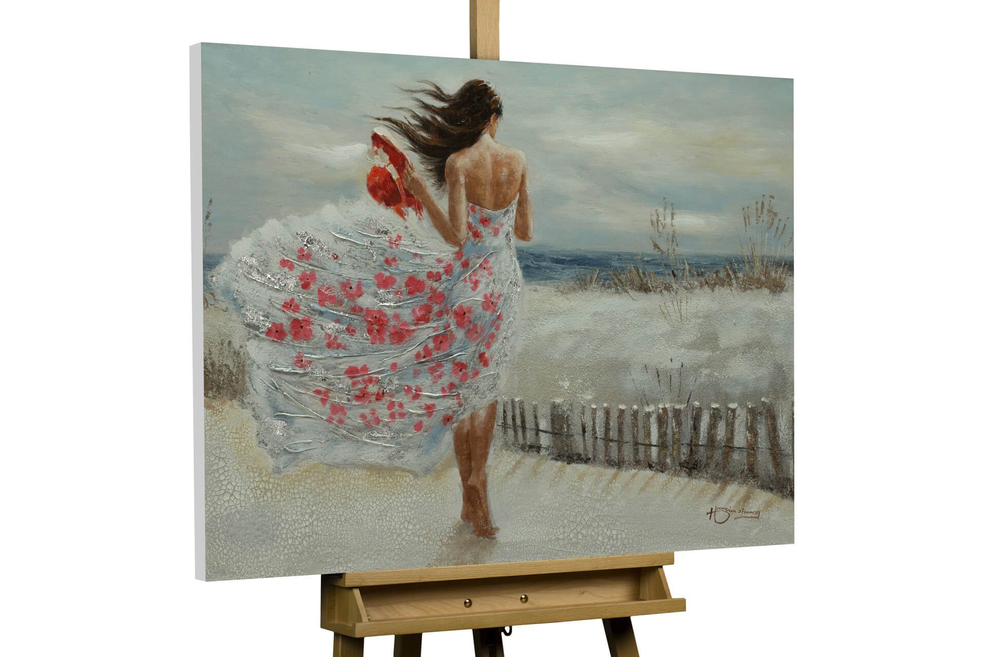 Ein 'Umhüllender Wind' umgarnt die junge Frau, die bei einem einsamen Spaziergang am Strand in Gedanken versunken ist. Ihr buntes Kleid spiegelt in Kombination mit dem handgemalten Silberglanz Leichtigkeit wider. Stellen Sie sich den salzigen Duft vor und lassen Sie sich von der Ausstrahlungskraft dieses Acrylgemäldes ans Meer bringen.