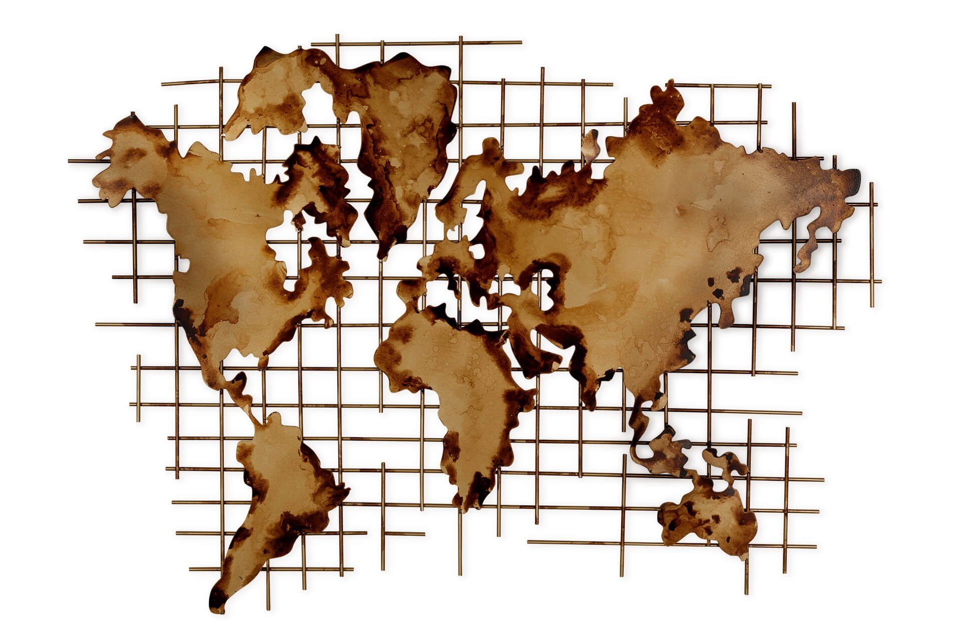 Beim Anblick der handgefertigten Wandskulptur 'Golden World' bekommt man augenblicklich Fernweh. Die abgebildete Weltkarte in Gold und Beige lädt dazu ein, ferne Länder zu erkunden und Ihnen noch unbekannte Städte zu bereisen. Mit diesem Wandrelief in Ihrem Schlafzimmer werden Sie stets an die Vielfalt auf Erden erinnert.
