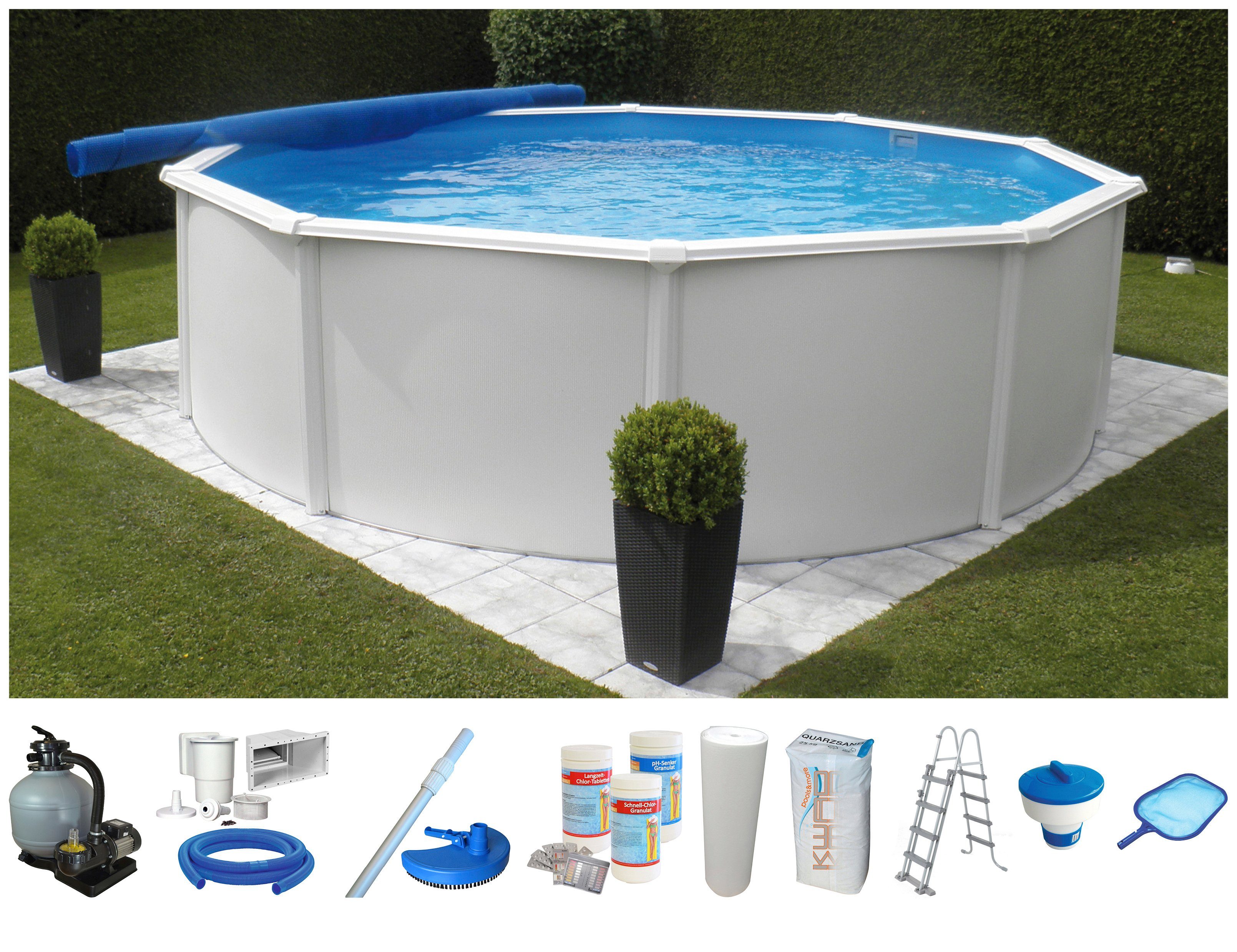 Lieferumfang | Bodensaugerbürste mit Teleskopstange Bodenschutzvlies Chlordosierer mit Thermometer (zufällige Farbauswahl) Kescher Leiter Quarzsand Sandfilteranlage Wasserpflegeset |