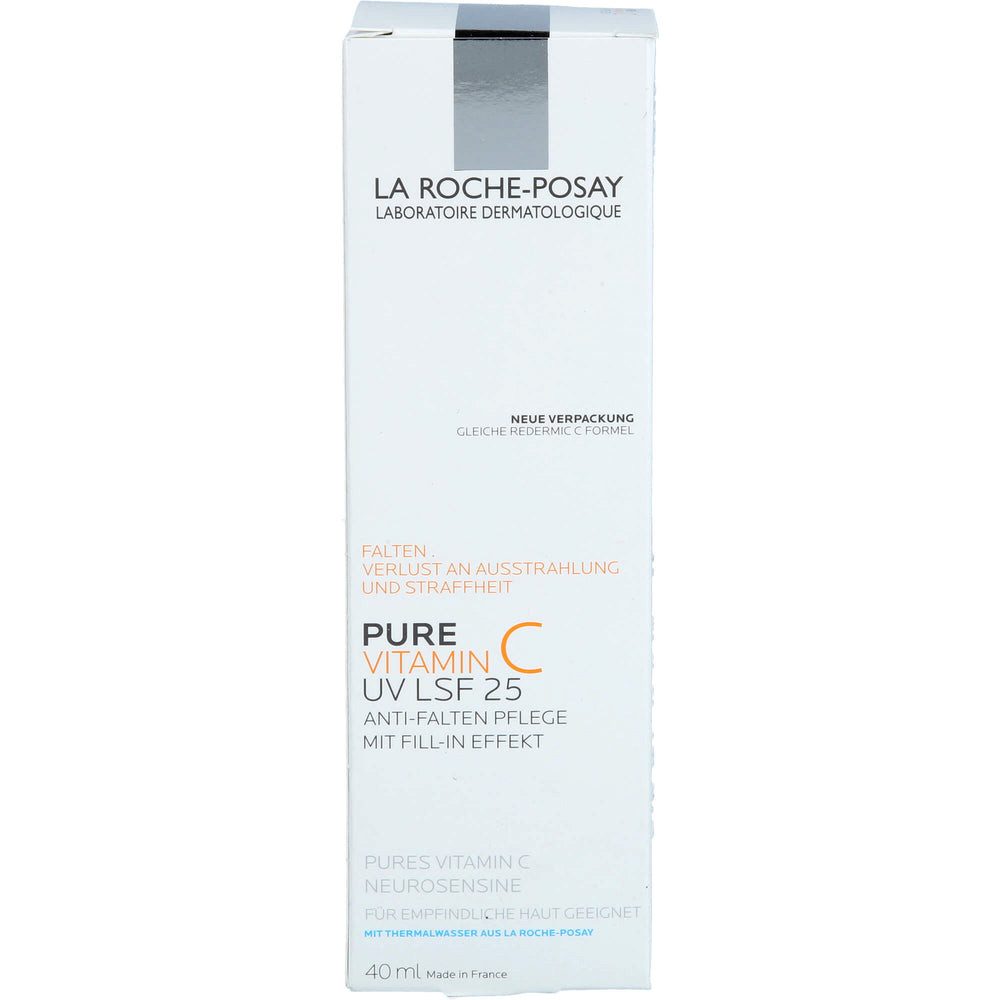 Mit der PURE VITAMIN C UV LSF25 Anti-Aging-Creme mit Fill-in Effekt werden bereits ausgeprägte Falten gemildert. Angereichert mit Thermalwasser aus La Roche-Posay wirkt die Anti-Aging-Pflege hautberuhigend. PURE VITAMIN C UV LSF25 mit Vitamin C, fragmentiertem Hyaluron und Madecassoside versorgt die Haut langanhaltend mit Feuchtigkeit, stimuliert die Kollagensynthese und wirkt antioxidativ gegen freie Radikale. Das Mexoryl® Filtersystem mit UVB LSF 25 - UVA PPD 10 schützt die Haut vor UVB-Strahlen und den täglichen Schäden durch UVA-Strahlen. Für mehr Straffheit und einen ebenmäßigen Teint eignet sich PURE VITAMIN C UV LSF25 als Anti-Aging-Pflege besonders für empfindliche Haut.