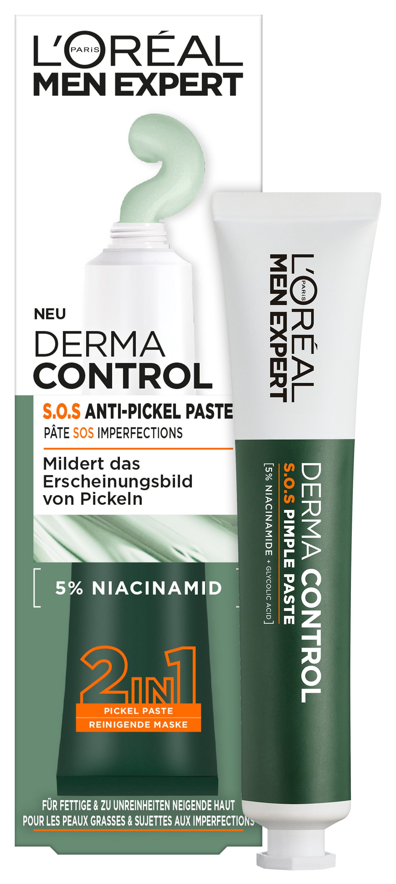 Anwendung | Bevor die innovative 2in1 S.O.S. Anti-Pickel Paste auf die Haut aufgetragen wird, sollte die Haut bereits vorab mit weiteren Produkten der Derma Control-Serie vorbereitet und gereinigt werden. Im nächsten Schritt wird nun die Paste auf die Gesichtshaut aufgetragen.Zur Anwendung als reinigende Maske mehrere haselnussgroße Mengen auf den Finger geben und die Paste so im Gesicht verteilen, bis das gesamte Gesicht – mindestens jedoch die T-Zone – bedeckt ist. Dabei den Bereich um die Augen und den Mund aussparen. Nach 5 Minuten Einwirkzeit die Paste mit klarem Wasser abspülen. Die 2in1 S.O.S. Anti-Pickel Paste kann ebenfalls zur punktuellen Pflege bei Pickeln angewendet werden. Dazu vor dem schlafen gehen die Paste auf den Pickel oder die gewünschte Stelle auftragen. Augenpartie aussparen. |