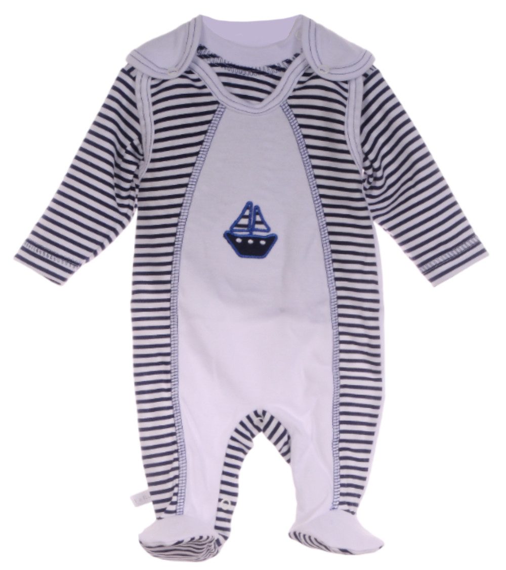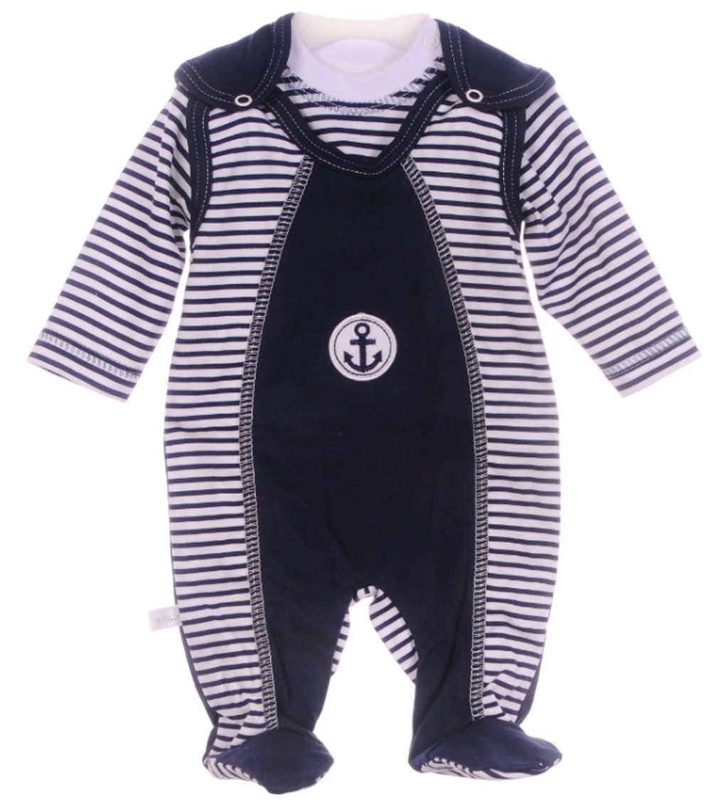 Maritimer Baby Anzug 2-teilig – Strampler & Langarmshirt Dieses wunderschöne Baby-Set aus 100% Baumwolle besteht aus einem ärmellosen Strampler in Navy-Blau mit einer hochwertigen Schiff-Applikation (Stickerei) sowie einem dazu passenden Langarmshirt in Weiß-Blau gestreift mit zwei Druckknöpfen am Hals für einfaches Anziehen. Die praktischen Druckknöpfe im Schritt und an den Schultern erleichtern das Wickeln und Umziehen. Dank des zeitlosen maritimen Looks eignet sich das Set perfekt für Baby Jungen und Mädchen – ein ideales Geschenk zur Geburt oder als liebevolle Erstausstattung.
