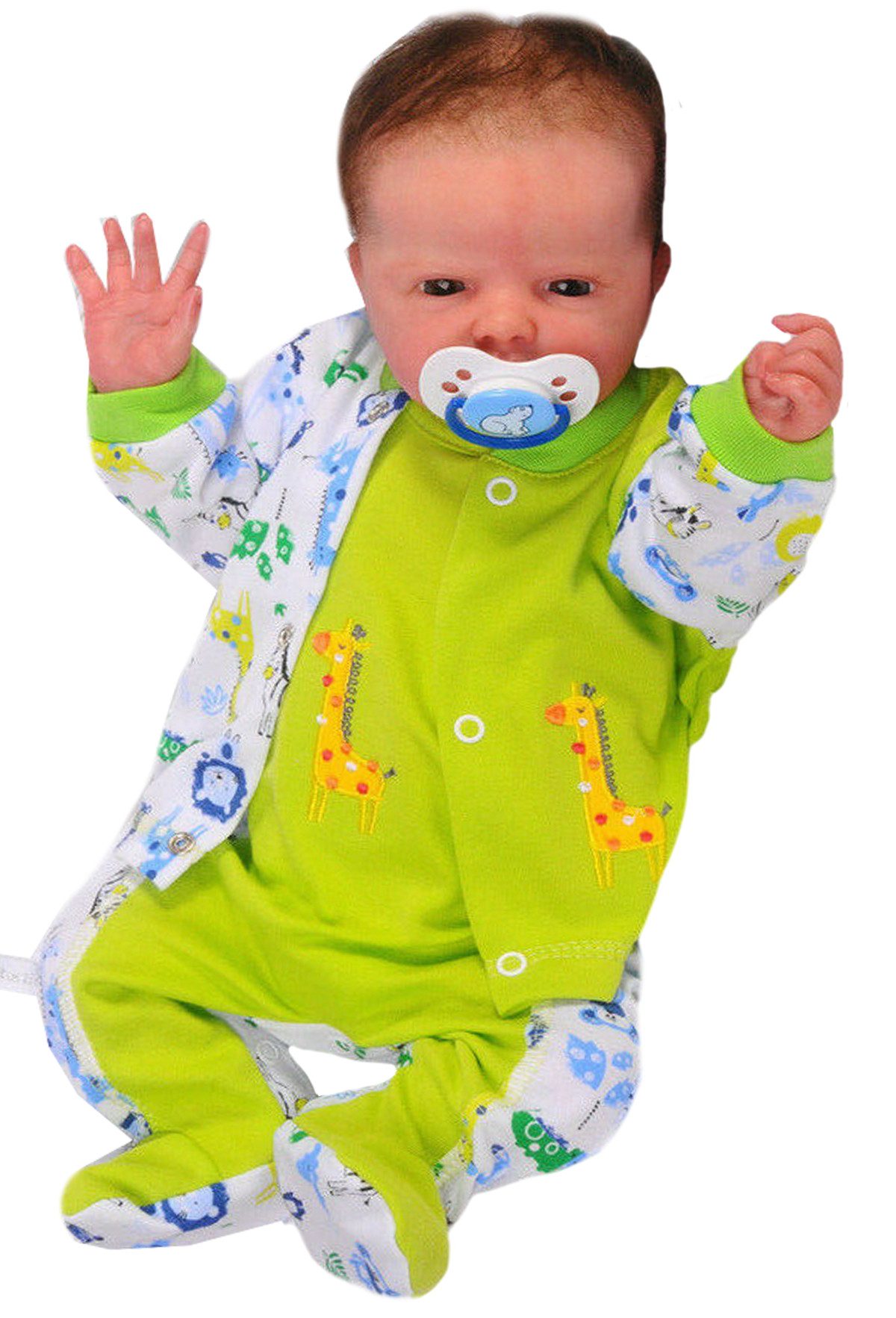 Dieses zweiteilige Set aus Strampler und Hemdchen ist ein praktisches und liebevoll gestaltetes Outfit für Babys und Kleinkinder. Gefertigt aus reiner, weicher Baumwolle, bietet es höchsten Tragekomfort und ist besonders hautfreundlich – ideal für den sensiblen Babyalltag. Das Set zeigt sich in einem frischen Grünton und ist mit einem fröhlichen Safari-Tier-Muster bedruckt, das bei kleinen Entdeckern für Begeisterung sorgt. Der Strampler verfügt über praktische Druckknöpfe im Schritt- und Schulterbereich, die das An- und Ausziehen sowie das Wickeln deutlich erleichtern. Auch das langärmelige Hemdchen ist mit Druckknöpfen versehen und lässt sich schnell und bequem öffnen und schließen. Dieses Set eignet sich perfekt für den Alltag, aber auch als liebevolles Geschenk zur Geburt oder zur Erstausstattung.