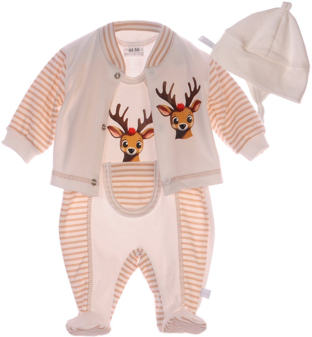 Erstlingsausstattung: Ein 3-teiliges Baby-Set, bestehend aus einem ärmellosen Strampler mit Streifen und Rentier-Print, sowie einer Brusttasche. An den Fersen ist eine Gummi integriert, für besseren Halt. Dazu gehört ein Hemdchen in Creme mit gestreiften Ärmeln und Print, sowie eine Mütze zum Binden in einfarbigem Design. Всі Teile sind aus reiner Baumwolle gefertigt, besonders weich und perfekt für zarte Babyhaut geeignet. Ein ideales Geschenk zur Geburt.