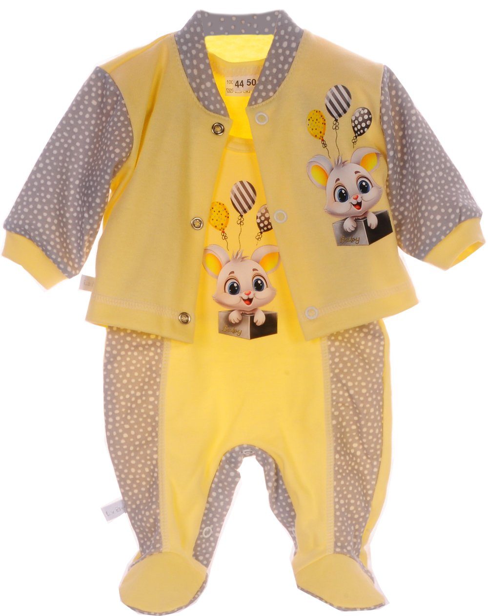 Entdecken Sie dieses zauberhafte 2-teilige Erstlingsausstattungs-Set, das mit seinem charmanten Design und strahlenden Farben sofort ins Auge fällt. Der ärmellose Strampler ist mit praktischen Druckknöpfen im Schritt und an den Schultern ausgestattet, für einfaches An- und Ausziehen. Das passende langärmelige Hemdchen ergänzt den Strampler perfekt und komplettiert den Look. Beide Teile sind mit einem wunderschönen Muster und einem einzigartigen Print versehen, der Frische und Freude ausstrahlt. Hergestellt aus reiner Baumwolle bieten sie höchsten Komfort für die zarte Babyhaut und sind in verschiedenen Größen erhältlich, um jedem Neugeborenen perfekt zu passen. Ob Frühling, Sommer, Herbst oder Winter - dieses Set ist für alle Jahreszeiten geeignet und wird Ihr Baby stets bequem und stilvoll kleiden. Mit seiner liebevollen Gestaltung und hochwertigen Materialien eignet es sich auch perfekt als Geschenk zur Geburt, um neuen Eltern eine Freude zu bereiten.