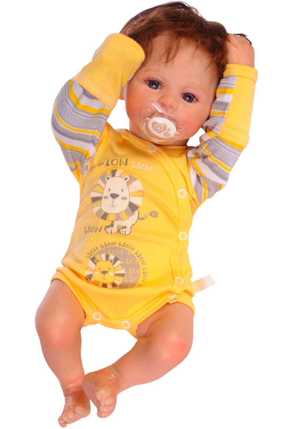 Wickelbody mit Kratzschutz – Sanfter Komfort für Ihr Baby Unser Wickelbody mit Kratzschutz ist die perfekte Wahl für Neugeborene und Babys, die höchsten Tragekomfort und Schutz benötigen. Das süße Design in Gelb mit Löwen-Aufdruck und gestreiften Ärmeln macht diesen Body zu einem echten Hingucker. Hergestellt aus 100 % reiner Baumwolle, ist der Babybody besonders weich, hautfreundlich und atmungsaktiv – ideal für die empfindliche Babyhaut. Die praktische Wickelöffnung mit Druckknöpfen erleichtert das An- und Ausziehen, ohne dass der Body über das Köpfchen gezogen werden muss. Dank des integrierten Kratzschutzes an den Ärmeln werden die empfindlichen Händchen Ihres Babys zusätzlich geschützt. Dieser bequeme und stilvolle Wickelbody eignet sich perfekt als Erstlingsausstattung oder als Geschenk zur Geburt oder Babyparty.