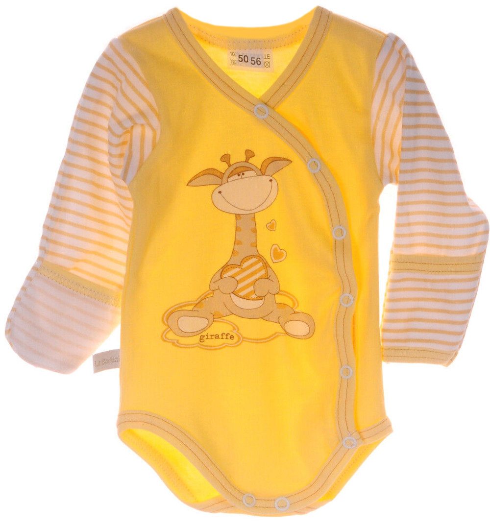 Dieser gelb-weiß gestreifte Wickelbody mit fröhlichem Giraffen-Aufdruck ist nicht nur ein Hingucker, sondern überzeugt auch durch seine durchdachte Funktionalität. Dank des praktischen Wickelverschlusses mit seitlichen Druckknöpfen lässt sich der Body ganz einfach an- und ausziehen – ideal für Neugeborene und junge Babys, ohne über das empfindliche Köpfchen ziehen zu müssen. Besonders liebevoll gestaltet ist der Body durch die extra langen Ärmel mit integrierter Kratzschutz-Funktion – auch bekannt als eingearbeitete Baby-Fäustlinge, die verhindern, dass sich dein Baby ungewollt im Gesicht kratzt. Der Body ist aus 100 % reiner Baumwolle gefertigt und dadurch besonders weich, atmungsaktiv und hautfreundlich – perfekt für empfindliche Babyhaut. In neutralem Design, geeignet für Mädchen und Jungen, ist dieser Body ein wunderschönes und praktisches Geschenk zur Geburt und ein Must-have in jeder Baby-Erstausstattung.