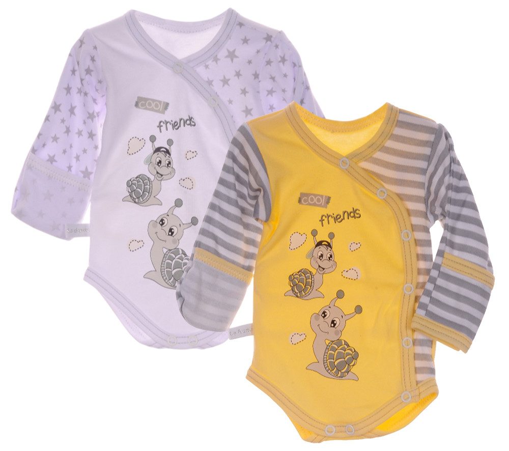Dieses 2er-Pack Wickelbodys vereint Komfort, Funktionalität und ein liebevolles Design. Hergestellt aus 100 % reiner Baumwolle, sind die Bodys besonders weich, hautfreundlich und atmungsaktiv, perfekt für die empfindliche Haut von Neugeborenen. Dank des praktischen Wickelverschlusses mit Druckknöpfen lassen sie sich ganz einfach an- und ausziehen, ohne über das Köpfchen gezogen zu werden. Das Set enthält zwei langärmelige Bodys mit extra Kratzschutz: Einen weißen Body mit Sternchen-Muster und einen gelb-grau gestreiften Body, beide mit niedlichem Schnecken-Aufdruck. Das geschlechtsneutrale Design macht sie ideal für Baby Jungen und Mädchen, wodurch sie sich perfekt als Geschenk zur Geburt, zu Ostern oder anderen besonderen Anlässen eignen. Durch die hochwertigen Materialien und die bequeme Passform sind diese Bodys für alle Jahreszeiten geeignet und ein unverzichtbares Basic in der Baby-Erstausstattung. Ein liebevolles Set, das Wärme, Schutz und Stil vereint!