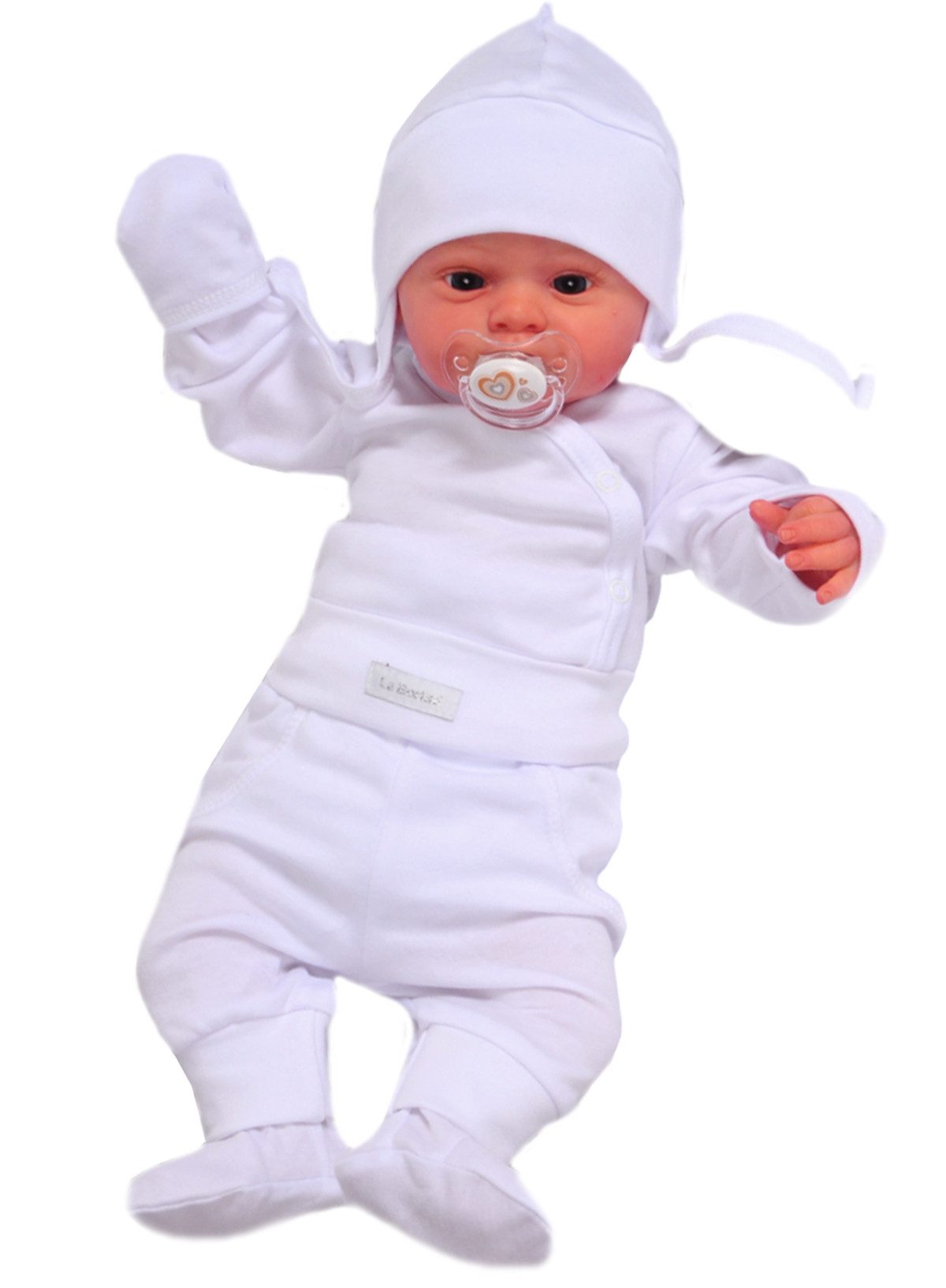 Dieser elegante Baby-Anzug ist die ideale Wahl für Neugeborene, Frühchen und Kleinkinder. Das Set, bestehend aus einem Wickelbody mit extra langen Ärmeln und integriertem Kratzschutz, einer bequemen Hose und einer praktischen Mütze zum Binden, ist aus hochwertiger Baumwolle gefertigt und bietet höchsten Tragekomfort für die zarte Babyhaut. Der Wickelbody aus reiner Baumwolle sorgt dank der Druckknöpfe für ein einfaches An- und Ausziehen. Die Hose mit einem elastischen Bund und Bündchen (95% Baumwolle, 5% Elasthan) bietet eine perfekte Passform und viel Bewegungsfreiheit, während die weiche Mütze mit Bindebändern das Outfit komplettiert. Produktmerkmale: Material: Wickelbody: 100% Baumwolle – weich, atmungsaktiv und hautfreundlich Hose und Mütze: Bund und Bündchen aus 95% Baumwolle, 5% Elasthan für Elastizität und Komfort Design: In klassischem Weiß, neutral und unisex – perfekt für Jungen und Mädchen Funktionalität: Extra lange Ärmel mit Kratzschutz, um die empfindliche Babyhaut zu schützen Wickelverschluss mit Druckknöpfen für einfaches Handling Elastische Bündchen für eine angenehme Passform Größen: Geeignet für Frühchen, Neugeborene und Kleinkinder Anlässe: Perfekt für die Taufe, die ersten Tage nach der Geburt oder als liebevolles Geschenk Dieser Baby-Anzug ist ein wunderbares, vielseitiges Set, das sowohl für den Alltag als auch für besondere Anlässe wie die Taufe geeignet ist. Das schlichte, neutrale Design macht ihn zur idealen Wahl für jedes Baby, unabhängig vom Geschlecht. Ein durchdachtes Geschenk, das Eltern und Babys gleichermaßen begeistert!
