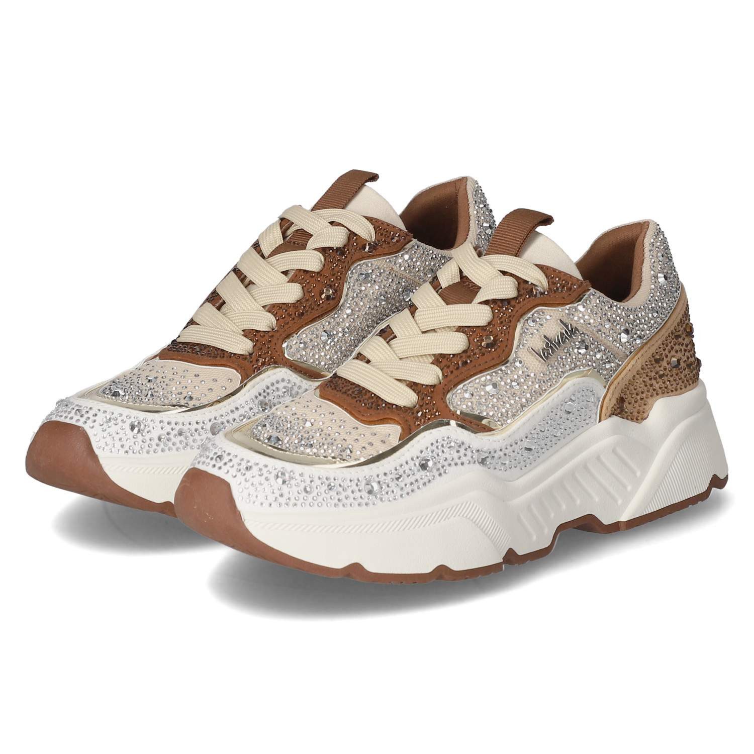 Die La Strada Damen Low Sneaker in Beige aus Synthetik-Textil-Mix bieten einen stilvollen Look mit glänzenden Schmucksteinen, die dem Schuh einen eleganten Touch verleihen. Die Schnürung sorgt für einen sicheren Halt, während die Anziehhilfe das An- und Ausziehen erleichtert. Der verstärkte Zehen- und Fersenbereich garantiert zusätzlich Schutz und Stabilität. Akzente in verschiedenen Brauntönen und in Weiß sowie der silberne Markenschriftzug setzen modische Highlights. Der gepolsterte Einstieg und das Memory Foam Fußbett bieten einen hohen Tragekomfort, während die rutschhemmende Plateausohle für sicheren Halt sorgt. Ein Schuh, der sowohl Komfort als auch Stil vereint.