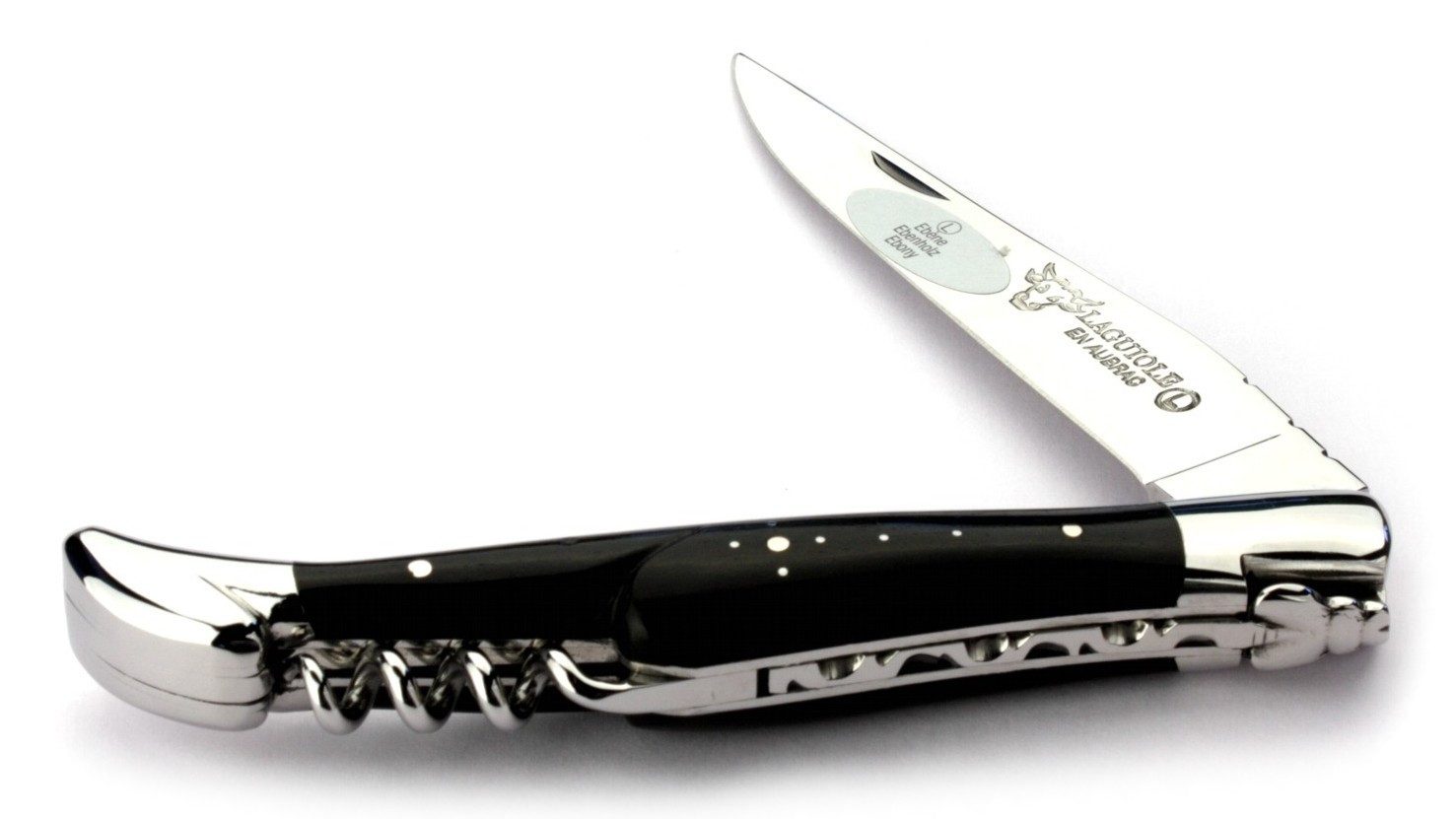 Sehr schönes 12cm-Messer mit Griffschalen aus schwarzem Ebenholz. Hergestellt wurde es in der bekannten Traditionsschmiede Laguiole en Aubrac.